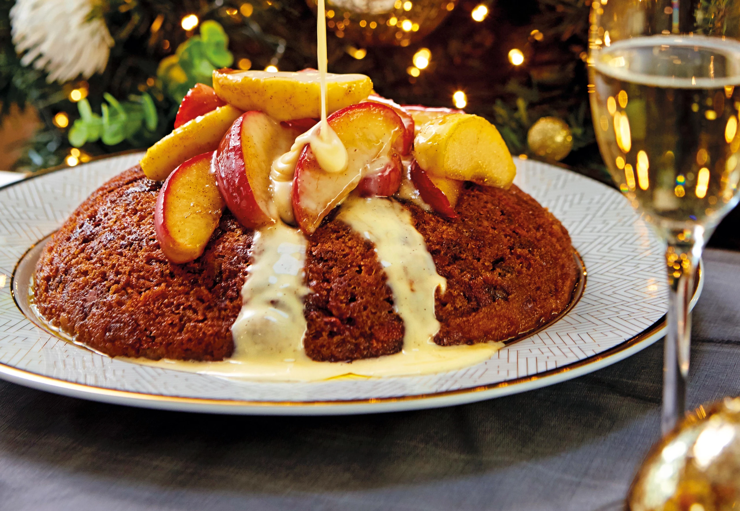 Kuchen aus dem Wasserbad nehmen und 5 Minuten ruhen lassen. Aus der Schüssel stürzen, mit den Karamelläpfeln belegen und mit der Vanillesauce servieren.