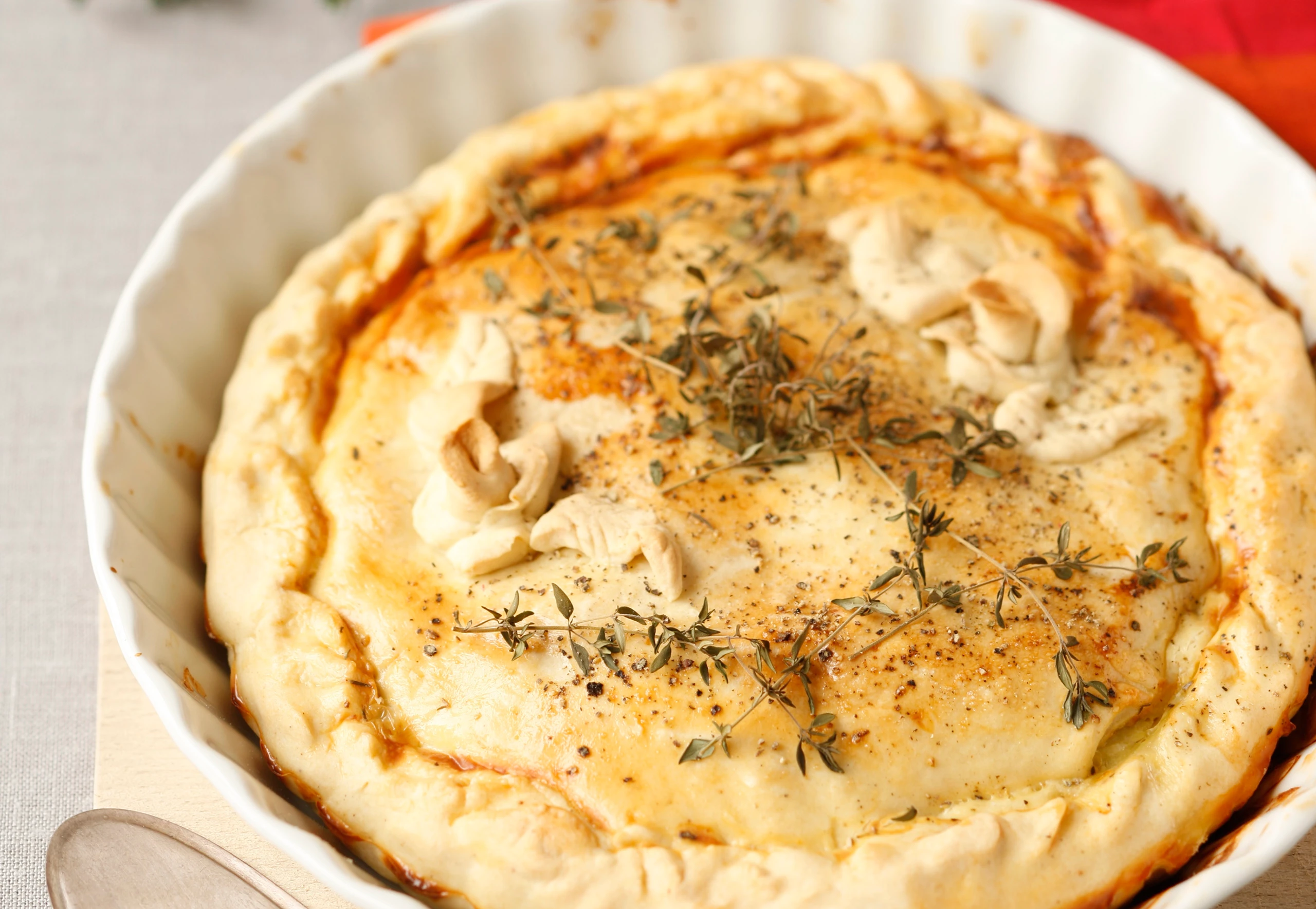 Zweite Teighälfte ausrollen, auf die Tarte legen und in die Mitte ein Loch stechen. Teig mit Ei bestreichen, Rand einschlagen. Eventuell mit Thymian bestreuen. Tarte im Rohr (untere Schiene / Gitterrost) ca. 50 Minuten backen.
