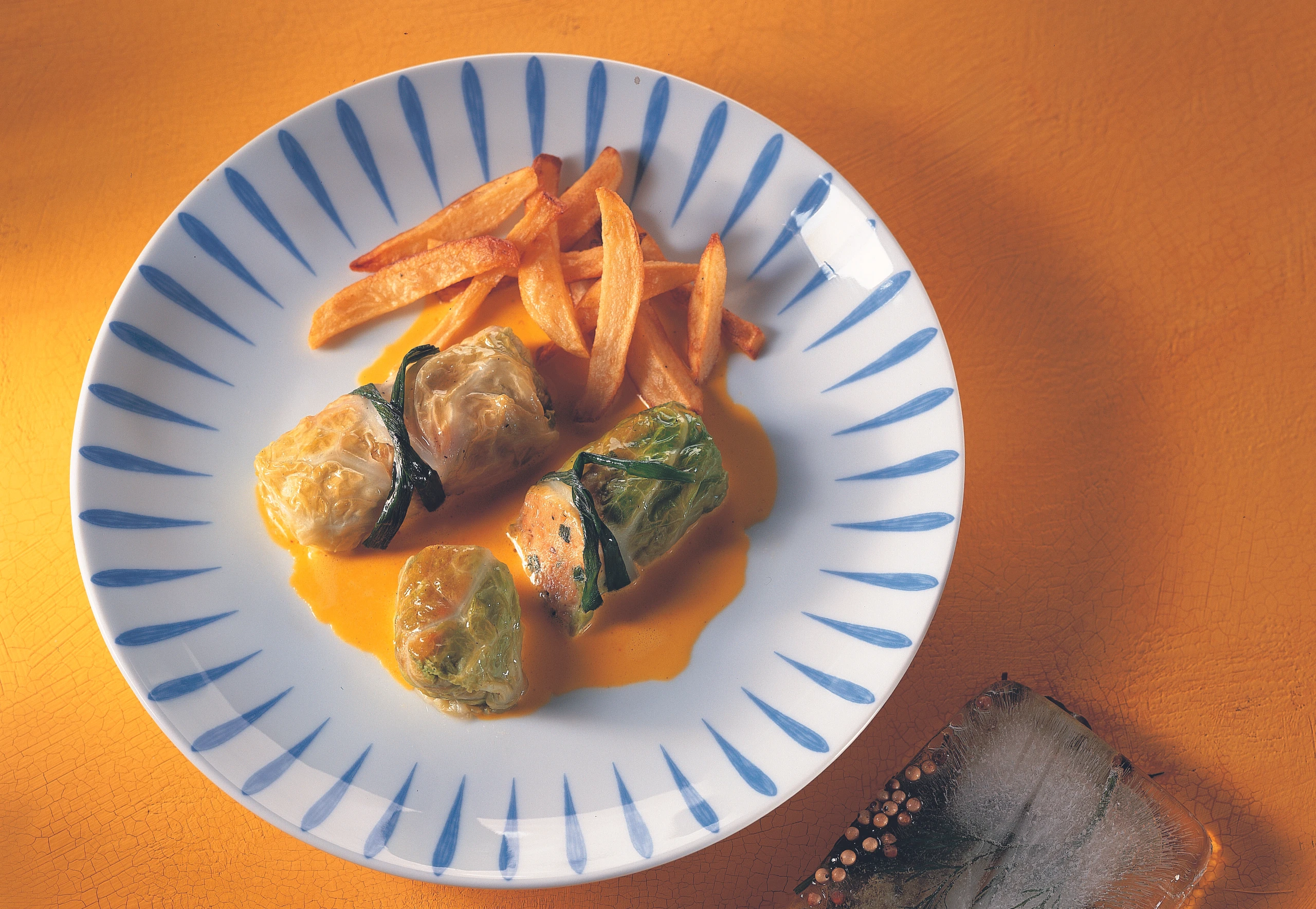 - Fond vom Garen der Kohlpäckchen (ca. 0,2 l; evtl. mit Suppe ergänzen) mit 1 Briefchen Safran vermischen und aufkochen. Hitze reduzieren und den Fond durch Einrühren kalter Butterstücke binden, Sauce nicht mehr kochen. Sauce mit Salz abschmecken.