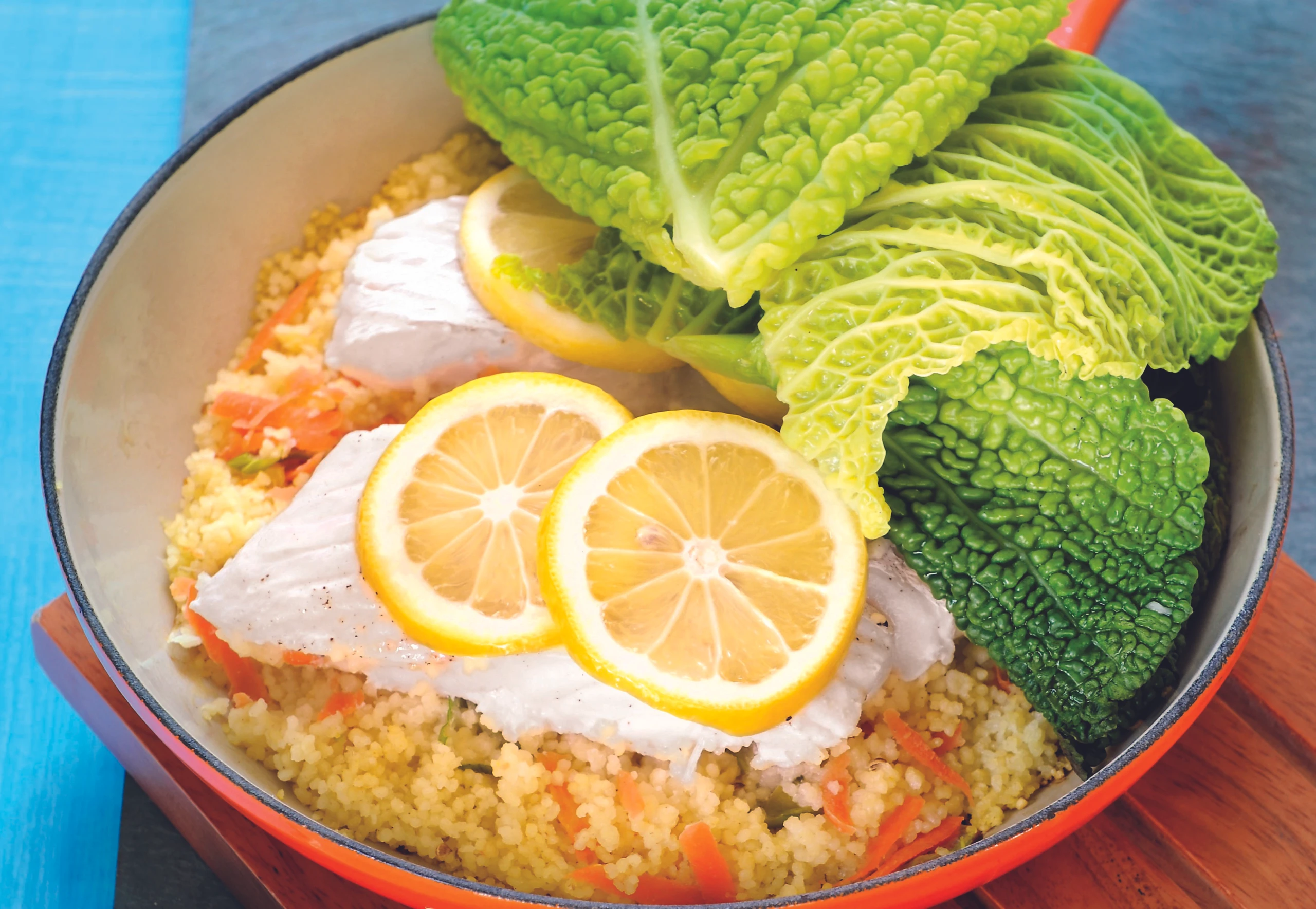 - Fisch mit 2 EL Zitronensaft, Salz und Pfeffer würzen und auf den Couscous legen. Zitronenscheiben auf den Fisch legen. Fisch und Couscous mit den Kohlblättern bedecken. Kohl salzen. Pfanne mit Alufolie dicht verschließen und einen gut sitzenden Deckel darauf-geben. Fisch und Couscous ca. 12 Minuten bei mittlerer Hitze dünsten.
