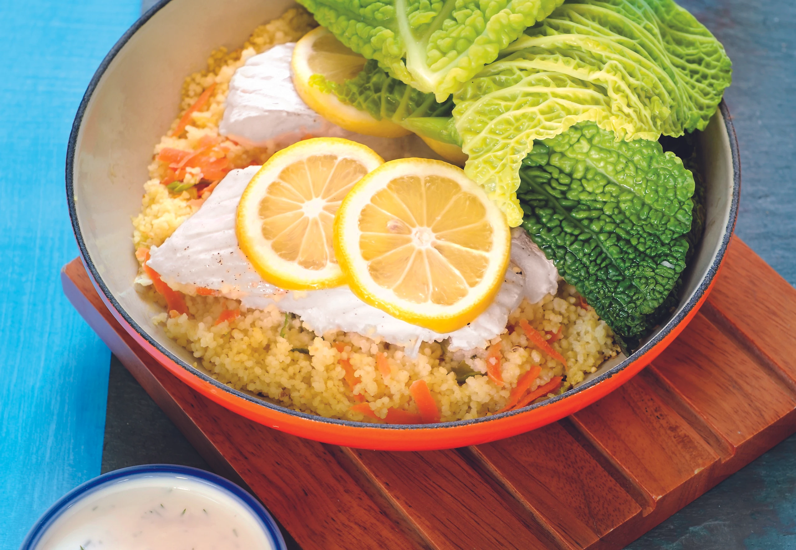- Für den Dip Joghurt, 1 EL Zitronensaft und Dille vermischen. Dip mit Salz und Pfeffer abschmecken. Kabeljau mit dem Couscous anrichten, mit Kohlblättern und Dip servieren.