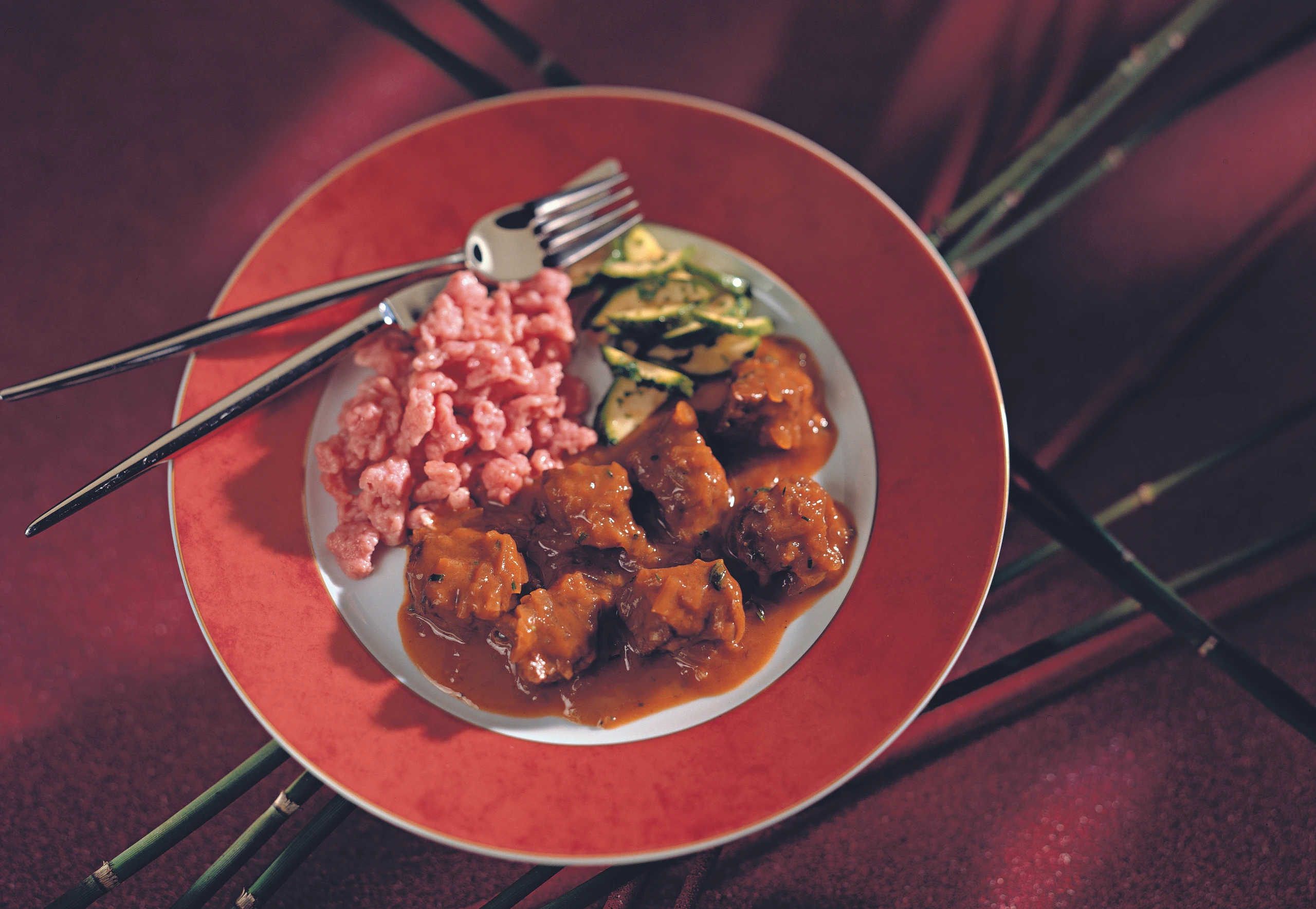 Gedünstetes Zwiebelfleisch mit Spätzle und Gemüse