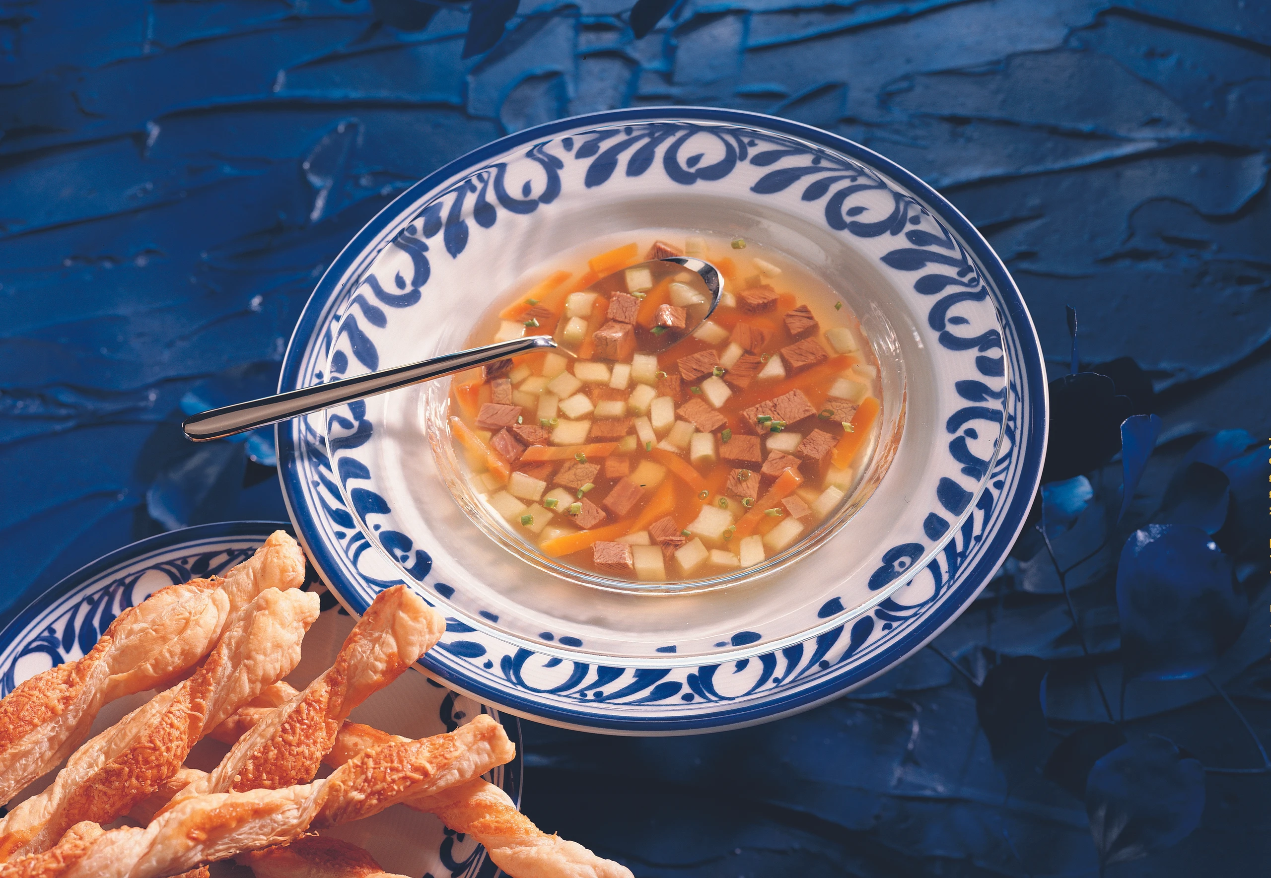 Gemüse und Fleisch aus der Suppe heben und in gleichgroße Stücke schneiden. Suppe durch ein feines Sieb oder ein Tuch gießen.