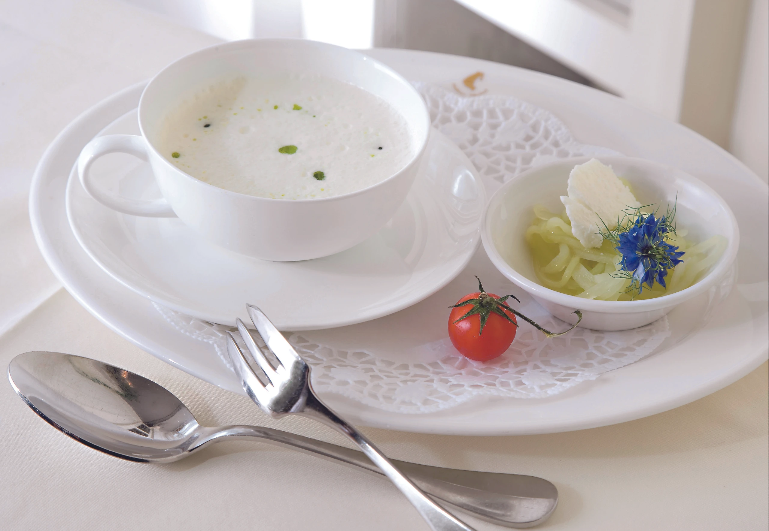 Gurke schälen, entkernen und in dünne Streifen schneiden. In Salzwasser überkochen, in Eiswasser abschrecken und abtropfen lassen. Gurkenstreifen mit der Suppe servieren. Suppe vor dem Anrichten mit dem Stabmixer aufschlagen, mit einigen Tropfen Gurkenöl anrichten.