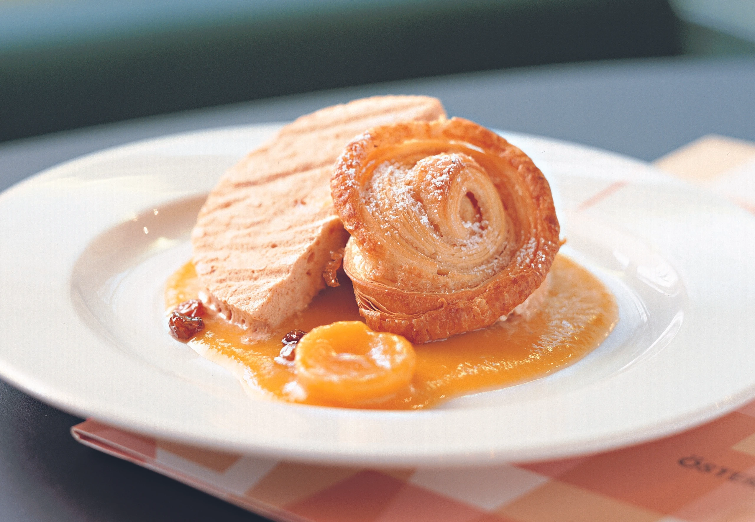 Schnecken auskühlen lassen und mit Staubzucker bestreuen. Parfait in Scheiben schneiden, auf den Marillen und Rosinen anrichten, mit den Zimtschnecken garnieren.