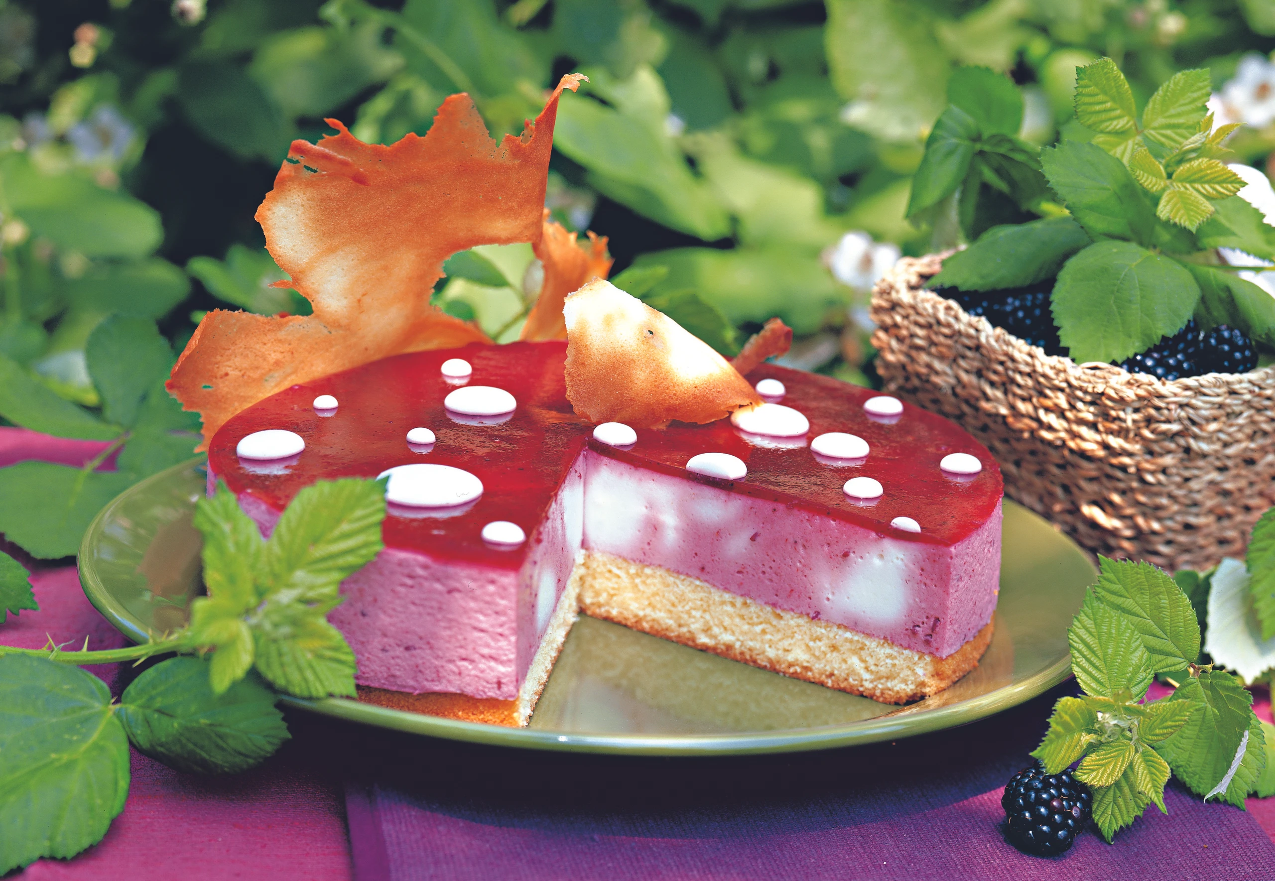 Beerengelee: Gelatine in kaltem Wasser einweichen. Brombeerpüree erwärmen, Gelatine ausdrücken und darin auflösen. Gelee auf die Torte gießen, Torte ca. 1 Stunde kühlen.