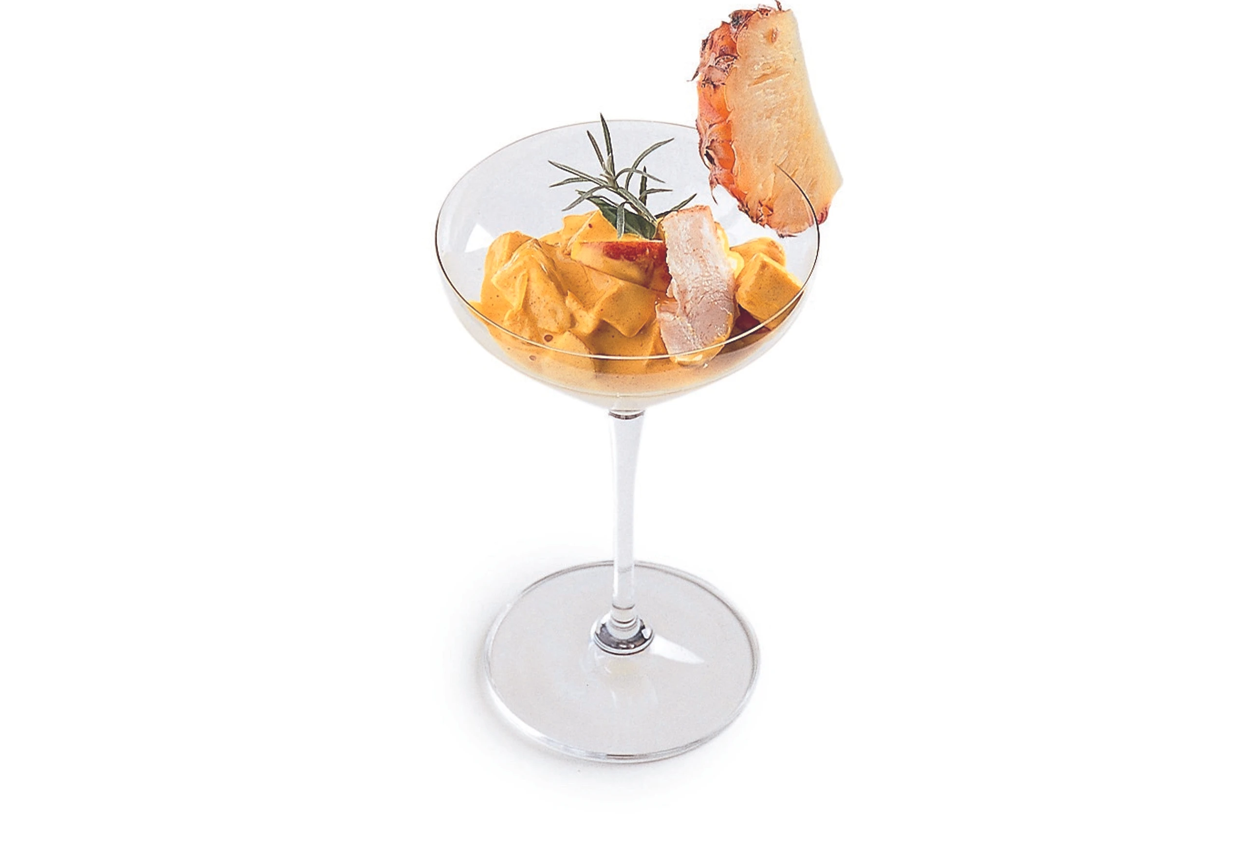 - Vom Hühnerfilet die Haut abziehen, vom Fleisch 4 Scheiben für die Garnitur abschneiden. Restliches Fleisch in ca. 1 cm große Stücke schneiden, unter das Dressing mischen, Früchte zugeben.