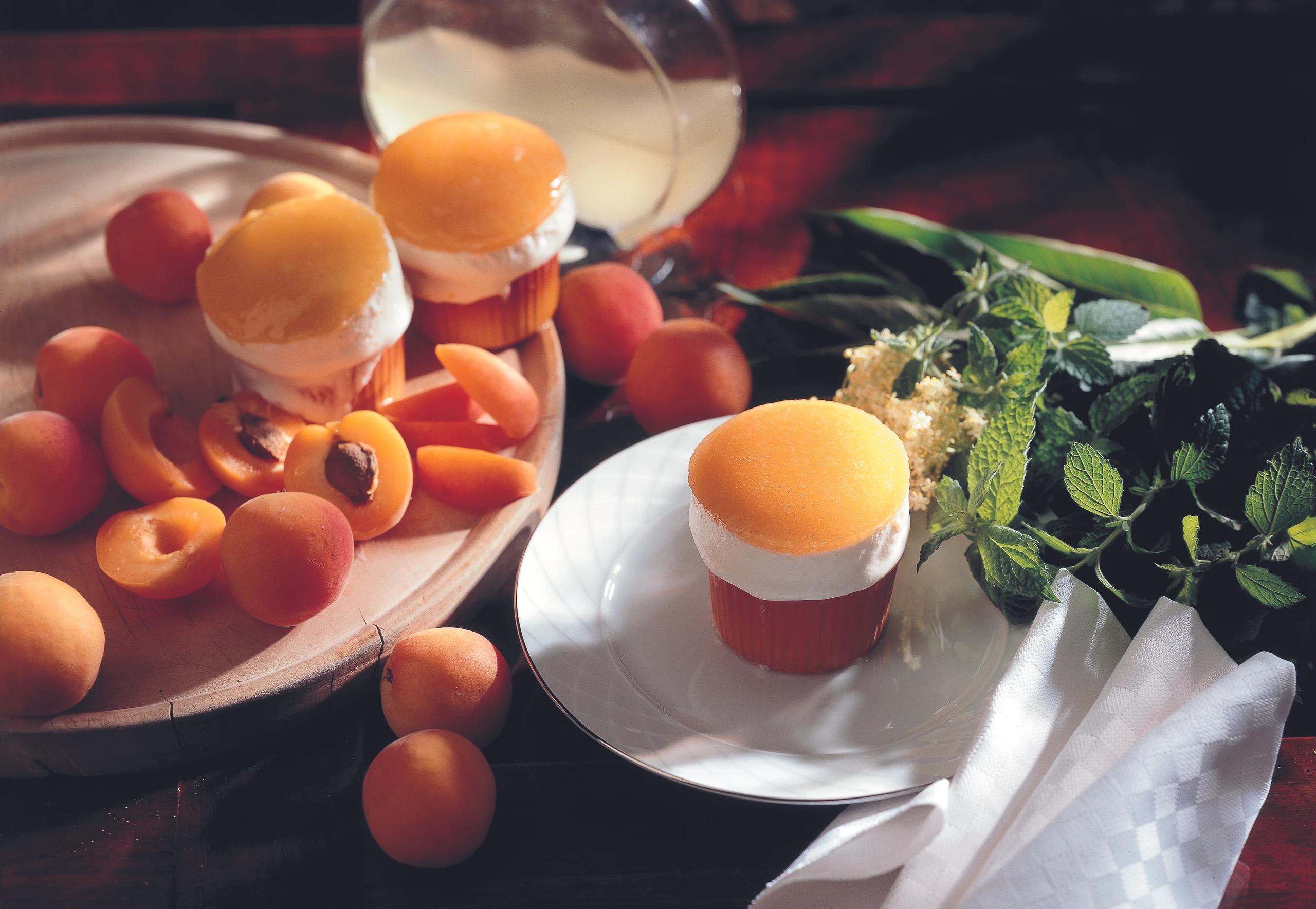 Für die „Kruste“ Gelatine in kaltem Wasser einweichen. Marillenpüree erwärmen und gut ausgedrückte Gelatine darin auflösen. Die Oberfläche der gefrorenen „Soufflés“ damit überziehen und festwerden lassen. Vor dem Servieren die Papierstreifen entfernen. Die „Soufflés“ in den Förmchen anrichten und eventuell zusätzlich mit Schlagobers garnieren.