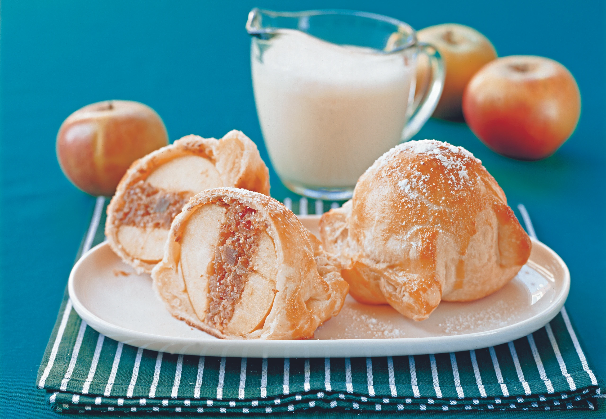 Teig auf einer bemehlten Arbeitsfläche ausrollen (40 x 25 cm) und in 4 Längsstreifen schneiden. Jeden Streifen an einem Ende mit Äpfeln belegen. Teig rundum mit Ei bestreichen. Äpfel im Teig einrollen, überstehenden Teig einklappen und andrücken.