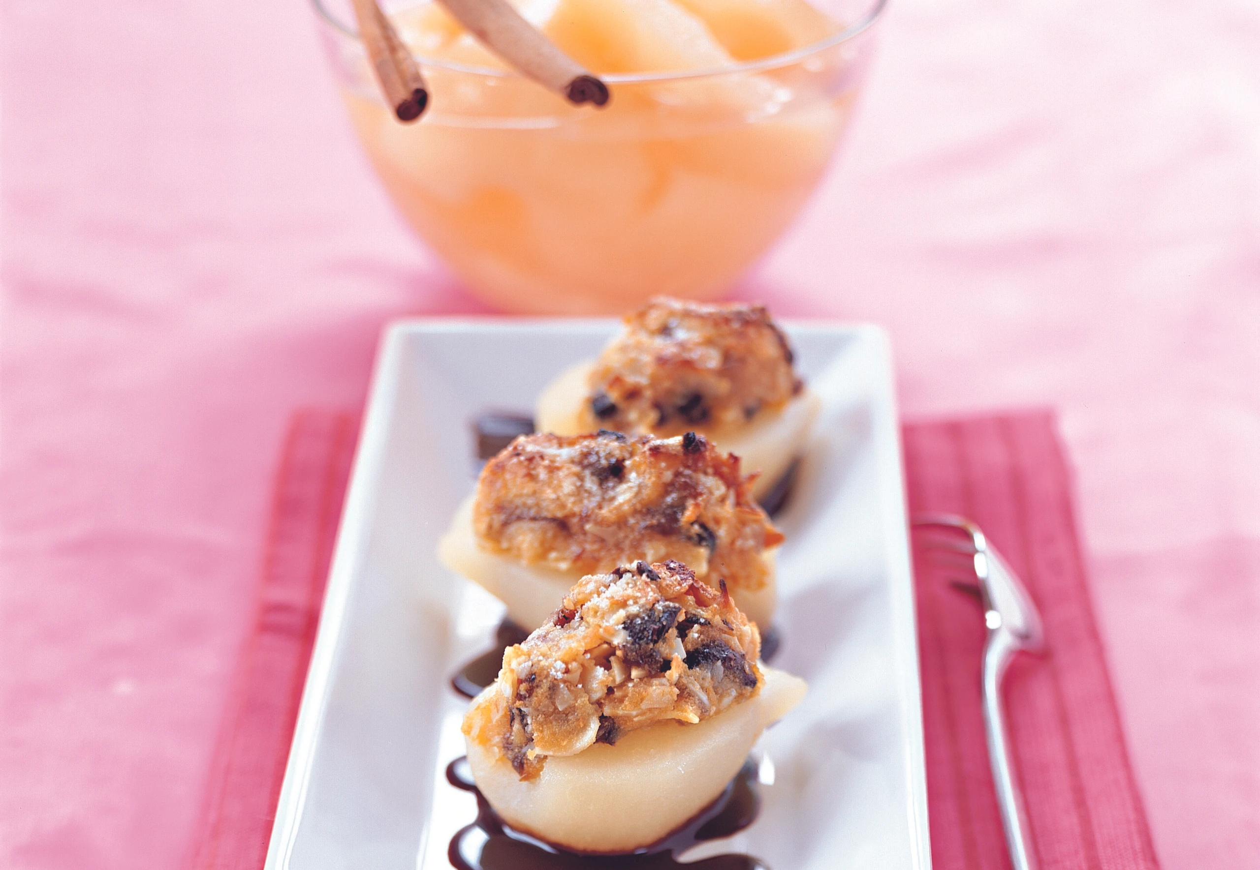 Birnen trockentupfen und an der Unterseite ein wenig abflachen. Birnen in die Form legen, mit der Masse füllen, mit Staubzucker bestreuen und im Rohr (mittlere Schiene / Gitterrost) ca. 12 Minuten überbacken. Dazu passt Schokoladesauce.
