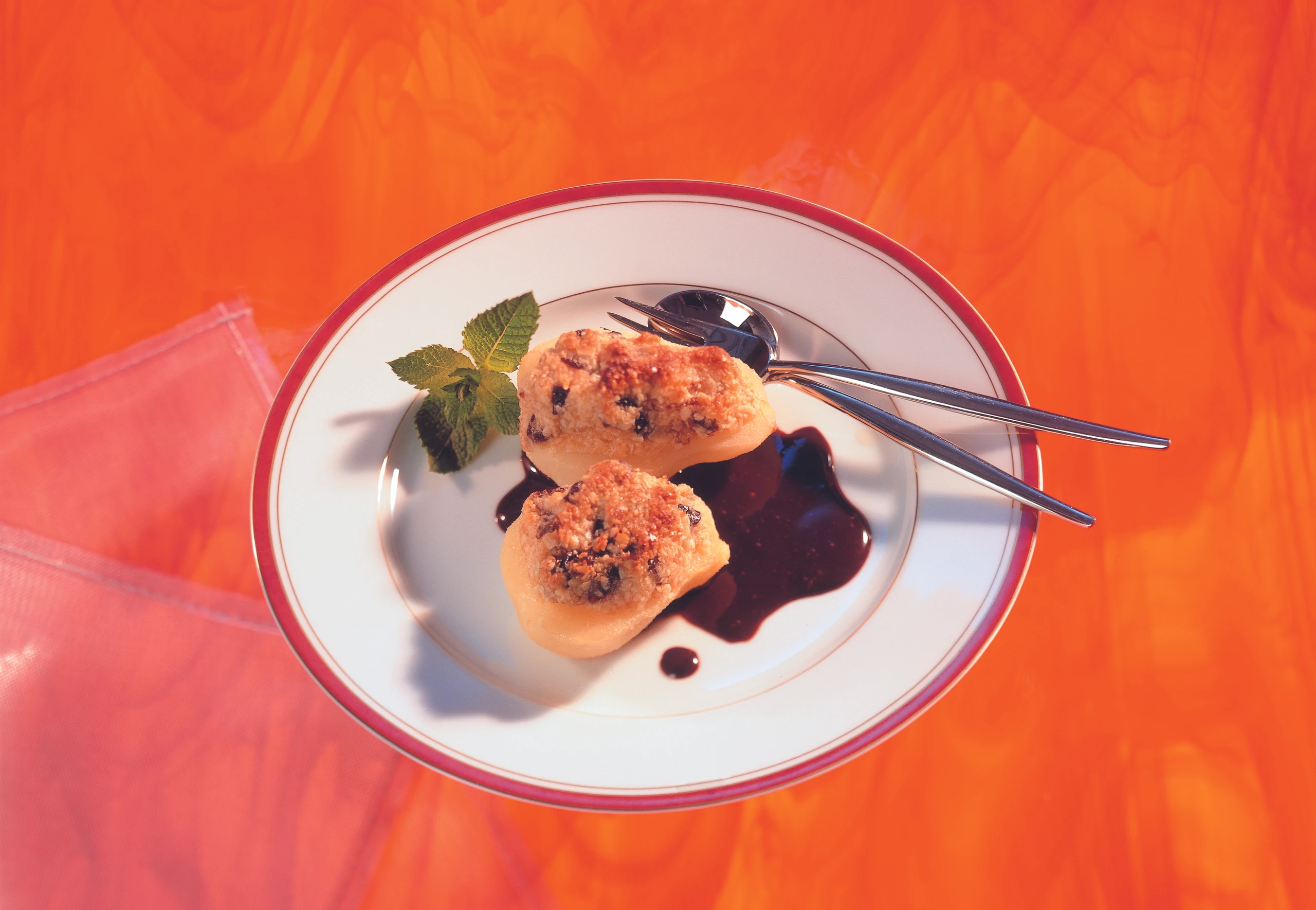 Dörrpflaumen in ca. 1/2 cm große Stücke schneiden und mit Biskotten, Mandeln, Orangensaft, Dotter, Zucker und Butter gut vermischen.