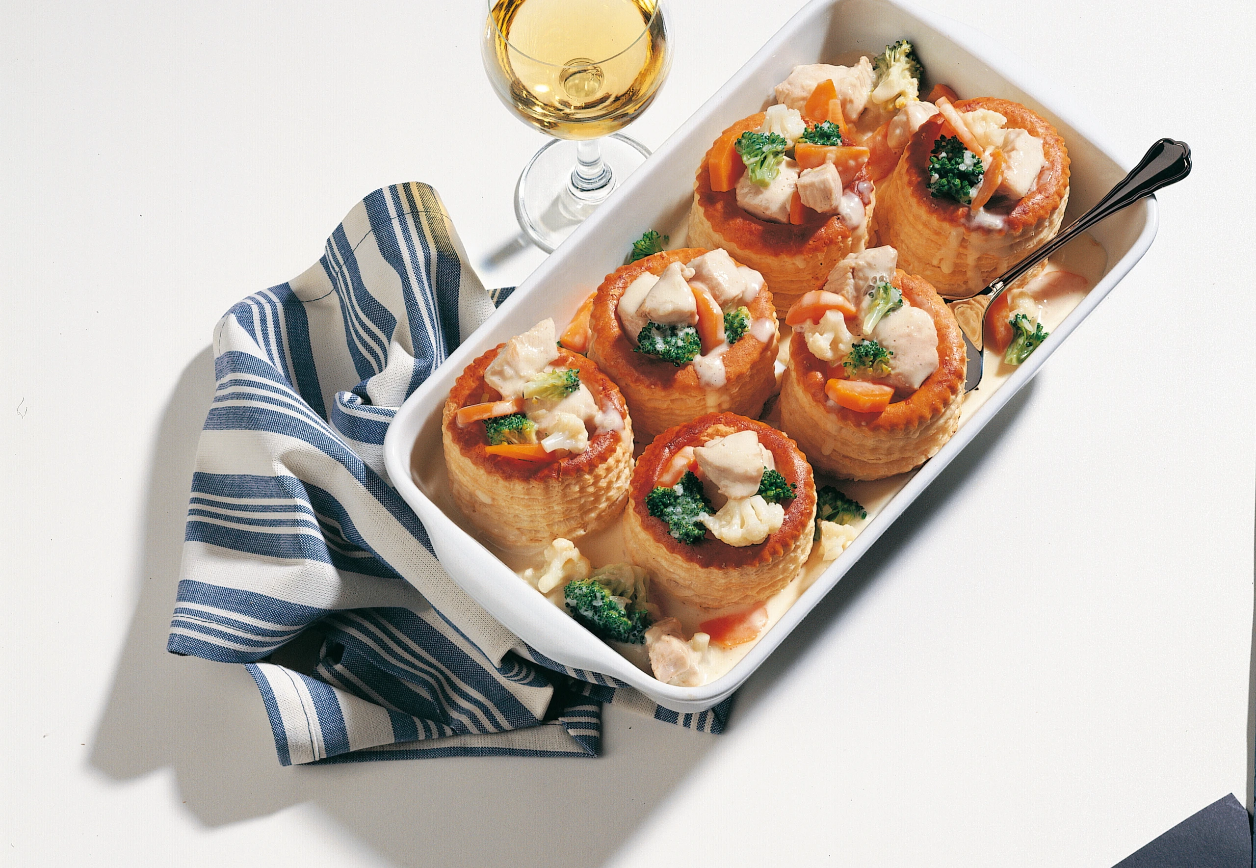 Parallel dazu Pastetchen im vorgeheizten Rohr erwärmen, auf Teller setzen, mit dem Ragout füllen und rasch servieren.