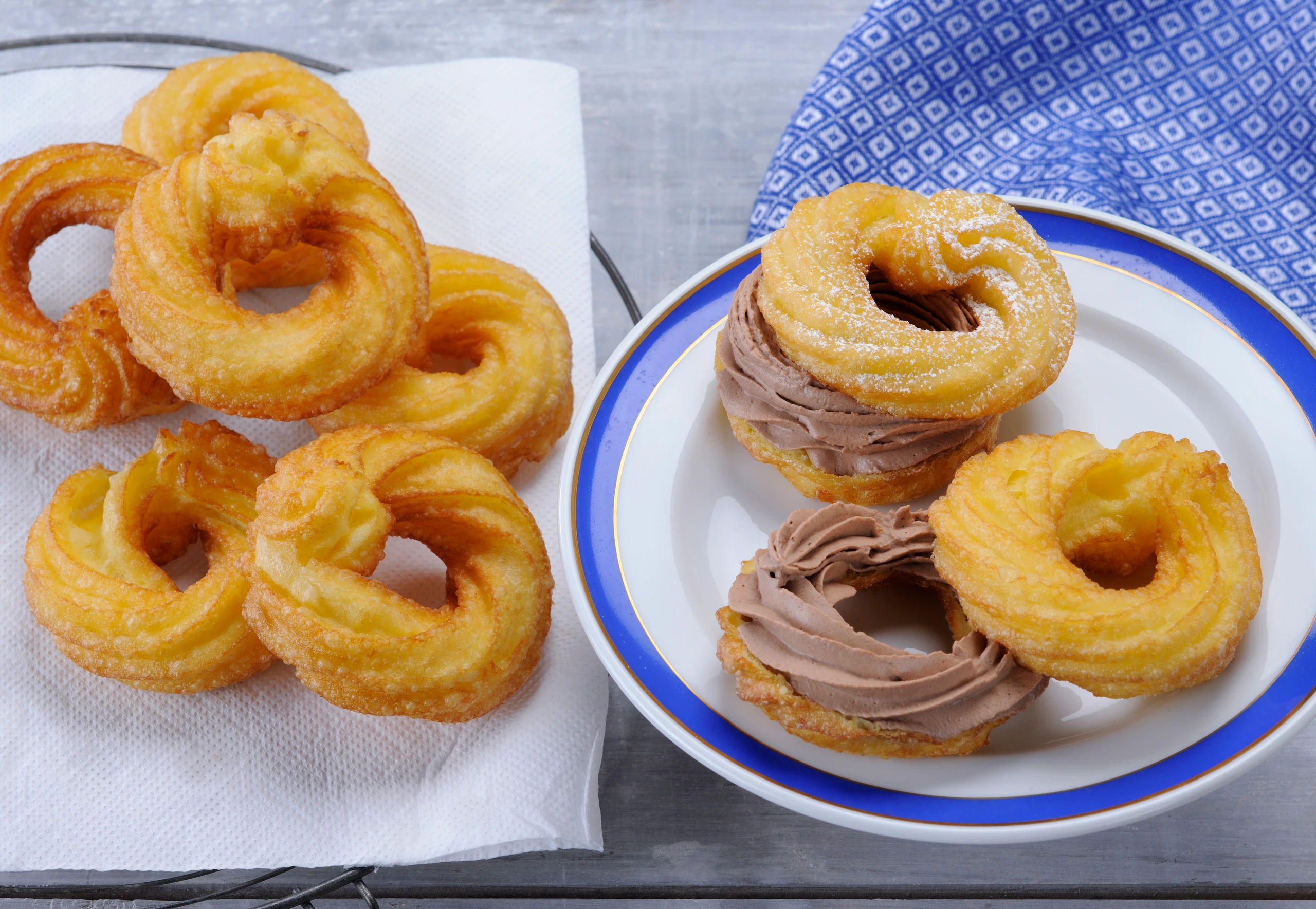 In einem breiten Topf 3 Finger hoch Öl auf ca. 160°C erhitzen. Ringe in mehreren Arbeitsgängen goldbraun backen: Ringe mit der Papierseite nach oben ins Öl legen, dabei eine Papierecke festhalten und die Ringe vom Papier ins Öl gleiten lassen. Ringe ca. 2 Minuten backen, wenden und ca. 2 Minuten fertig backen. Herausheben, auf Küchenpapier abtropfen und auskühlen lassen.