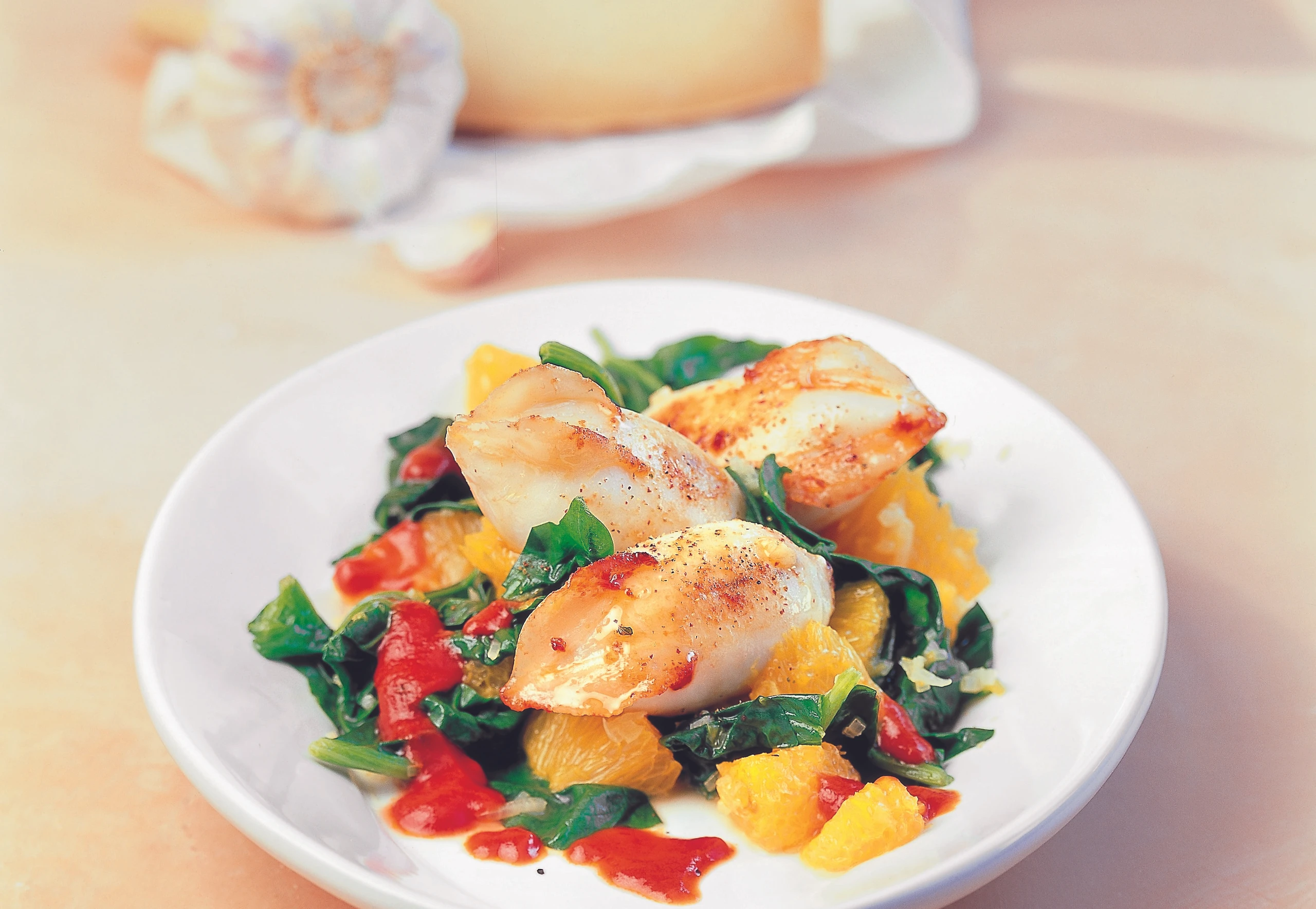 - Öl erhitzen, Schalotten und Knoblauch darin glasig anschwitzen, Spinat und Orangenstücke zugeben, mit Orangensaft ablöschen. Spinat ca. 2 Minuten braten, mit Salz und Pfeffer abschmecken.