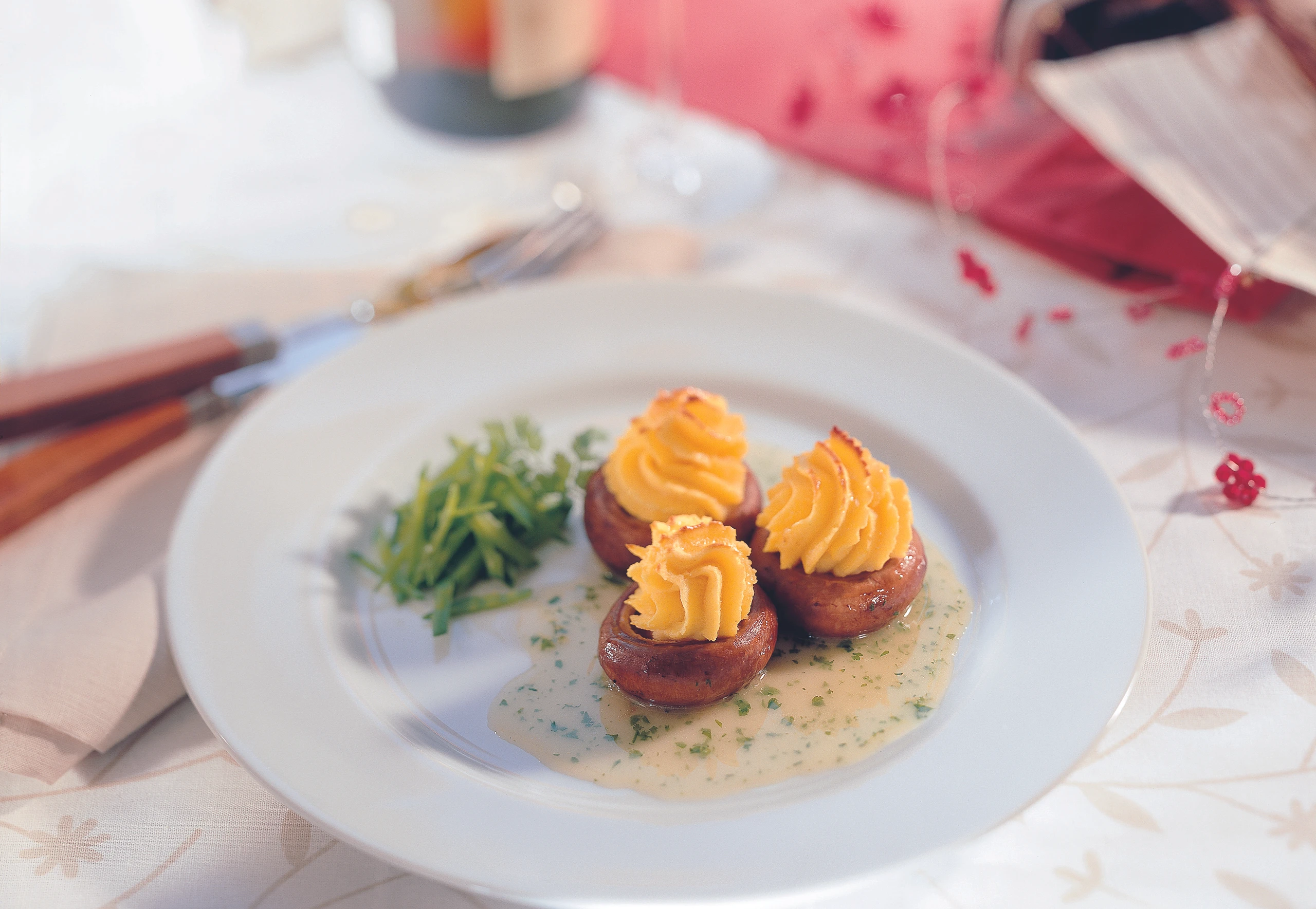- Backrohr auf 180 °C vorheizen. Erdäpfel abseihen, schälen und noch heiß durch eine Erdäpfelpresse drücken. Erdäpfel mit Dotter und Trüffelöl verrühren, salzen, pfeffern und in einen Dressiersack (Sterntülle) füllen.