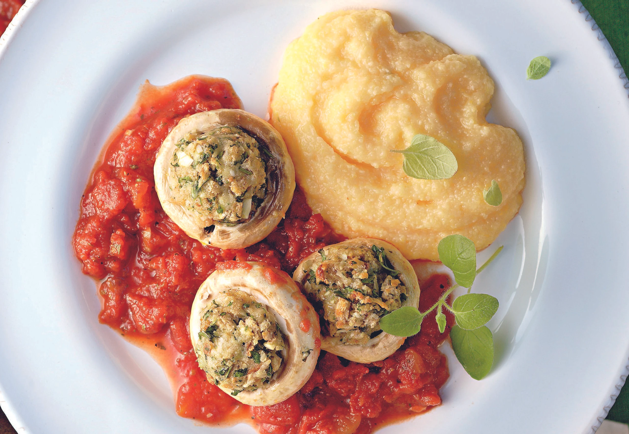 Rohr auf 180°C vorheizen. Paradeiswürfel mit den Kräutern, Salz und Pfeffer vermischen. Paradeis-Sugo in einer flachen Metallform gleichmäßig verteilen. Champignonköpfe in die Sauce setzen, mit Olivenöl beträufeln und im Rohr überbacken. Das dauert je nach Größe 16–20 Minuten. Am besten mit cremiger Polenta servieren.
