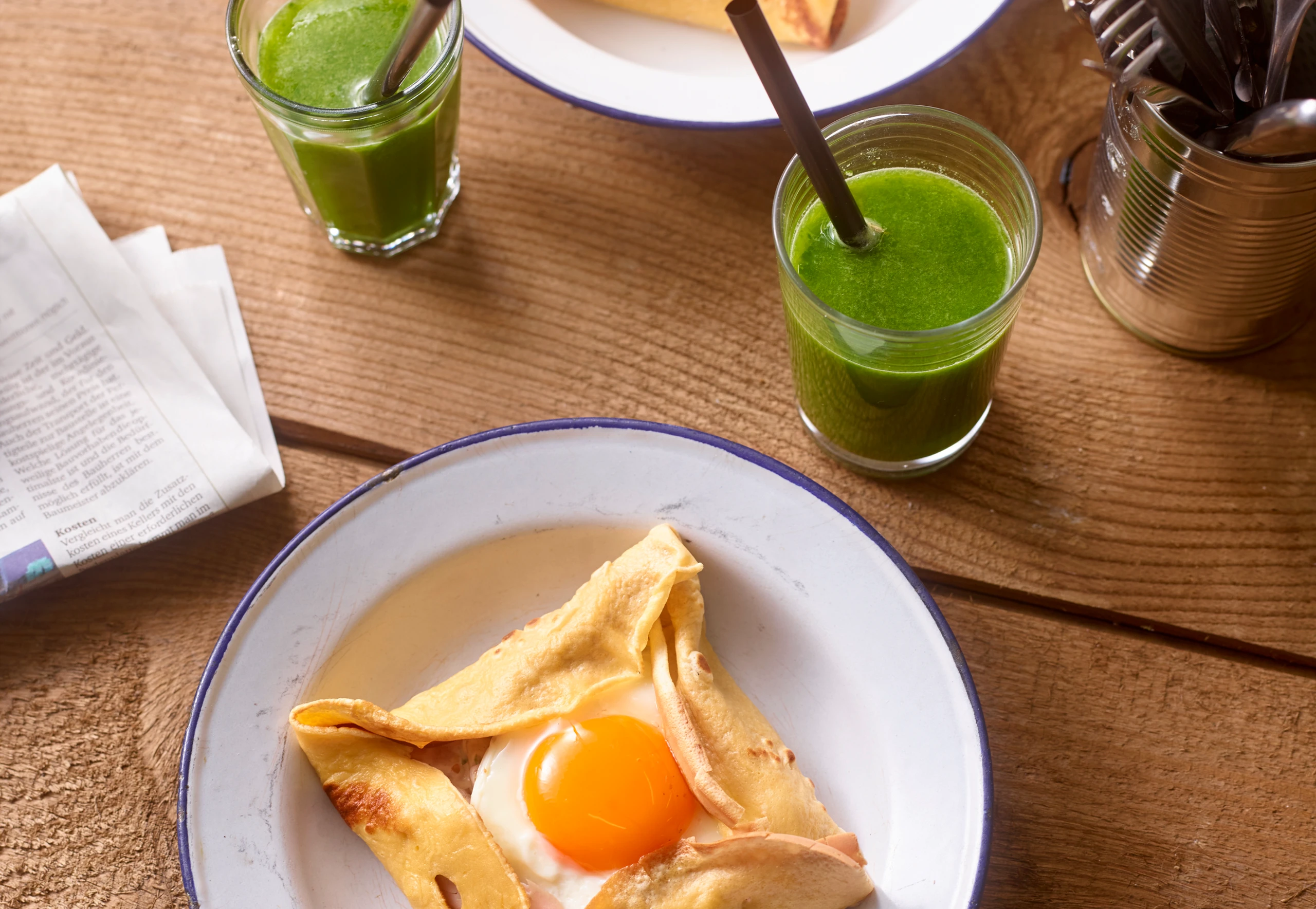 Rohr auf 180°C vorheizen. Backblech mit Backpapier belegen. Crêpes auflegen, Cheddar, dann Speck, Champignonmischung und zum Schluss je 1 Ei darauf legen. Ränder einschlagen.