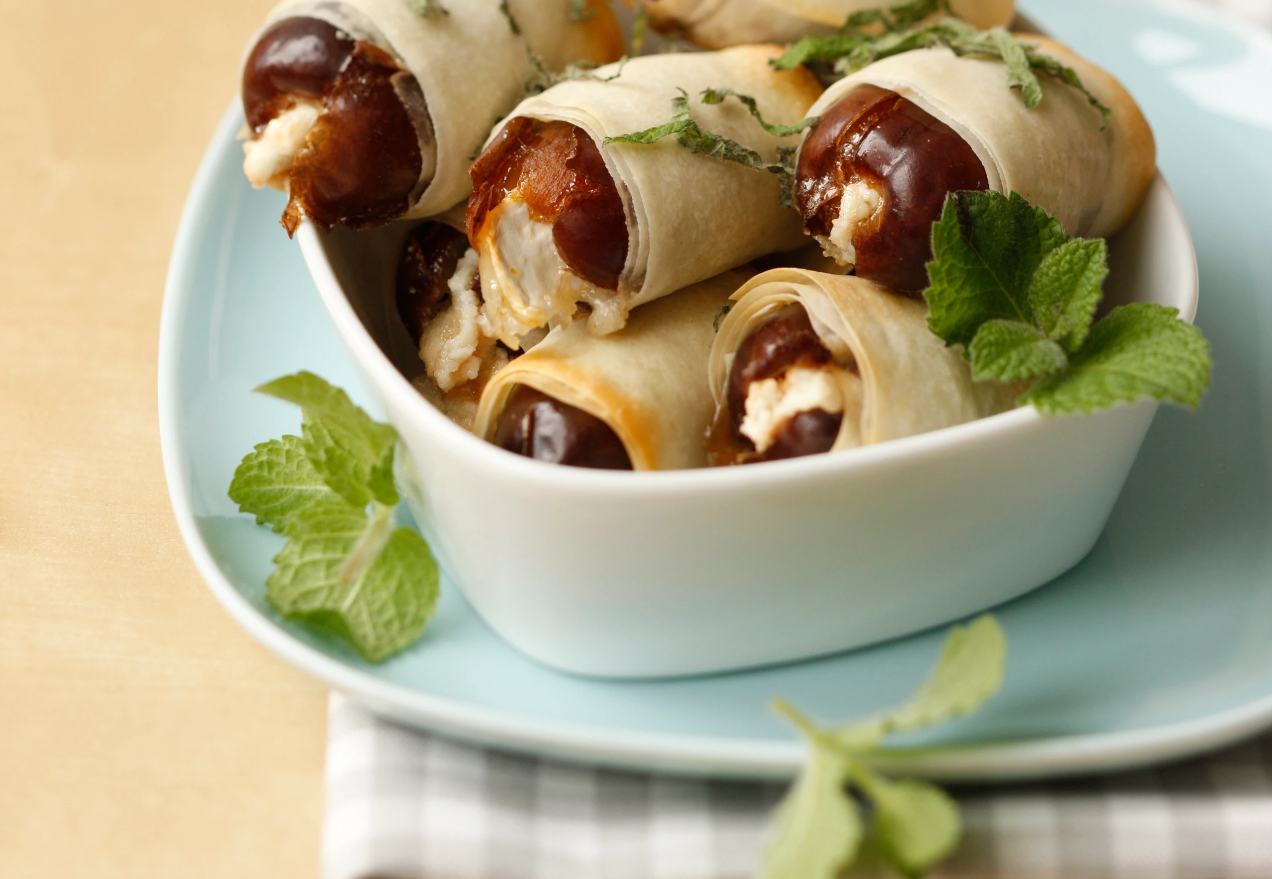 Rohr auf 190°C vorheizen. Backblech mit Backpapier belegen. 1 Teigblatt auf ein Tuch legen, in 8 Querstreifen schneiden und mit Butter bestreichen. Je 1 Dattel und 1 Minzeblatt in 1 Teigstreifen einrollen. Übrigen Teig ebenso verarbeiten.