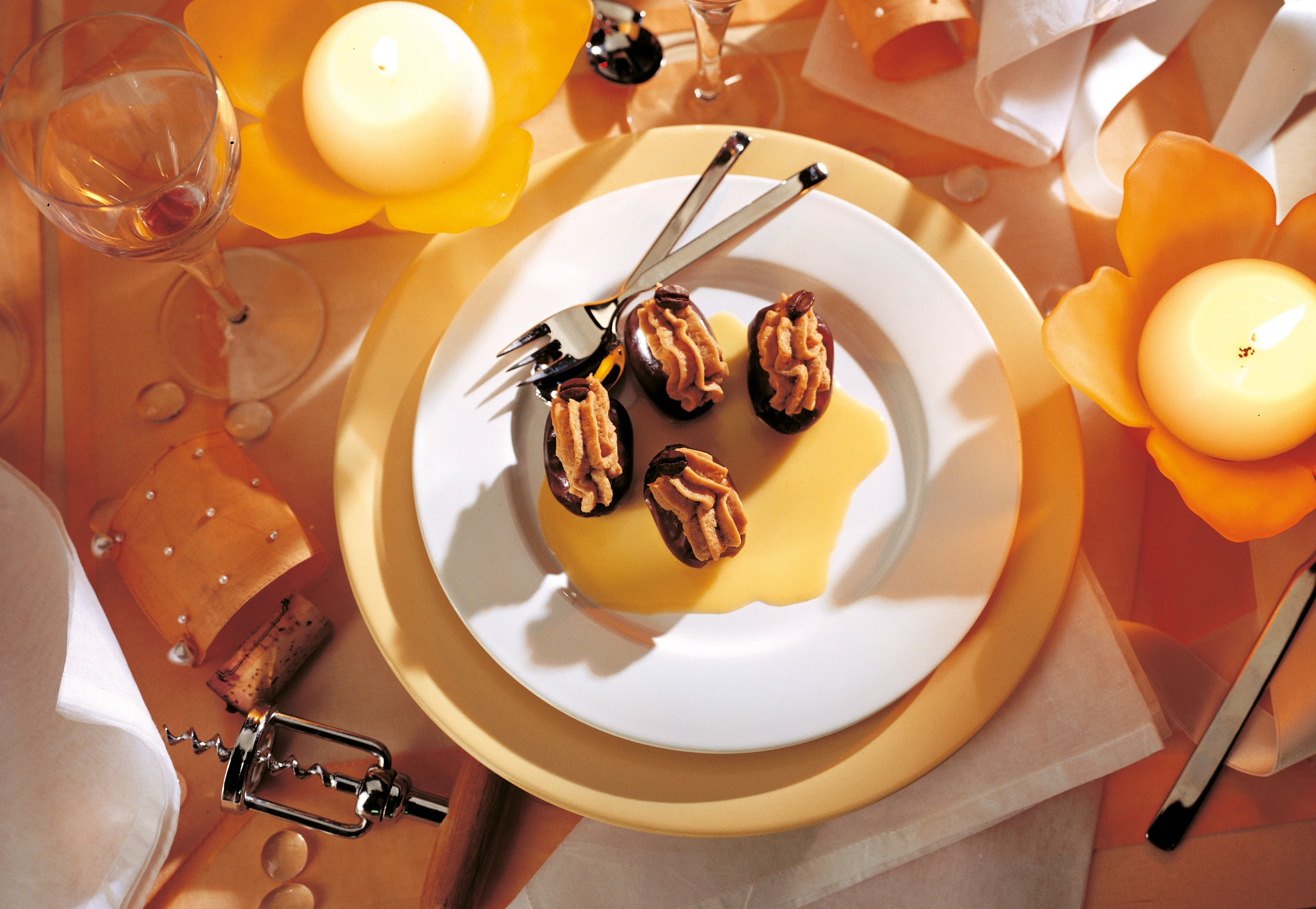 Datteln der Länge nach aufschneiden, Kerne entfernen. Mokkacreme in einen Dressiersack (mit kleiner Sterntülle) füllen und in die Datteln dressieren. Datteln mit je einer Kaffeebohne garnieren.