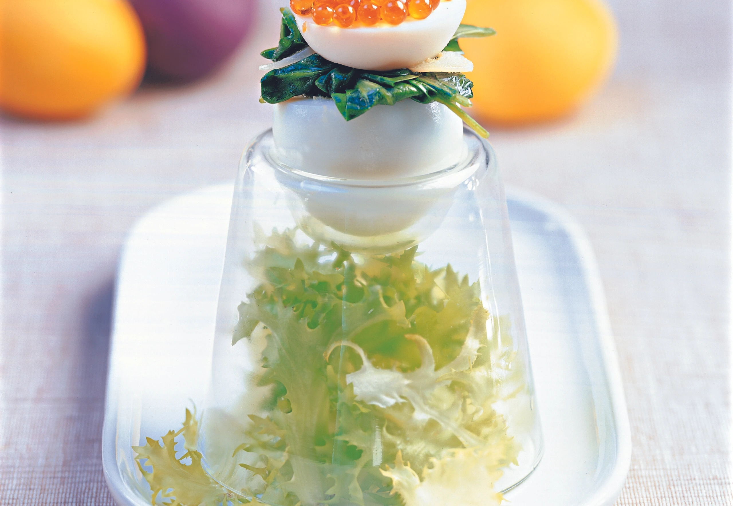 Eier mit der Spinatmasse füllen, die Kappen umgedreht darauf setzen, mit Kaviar garnieren.