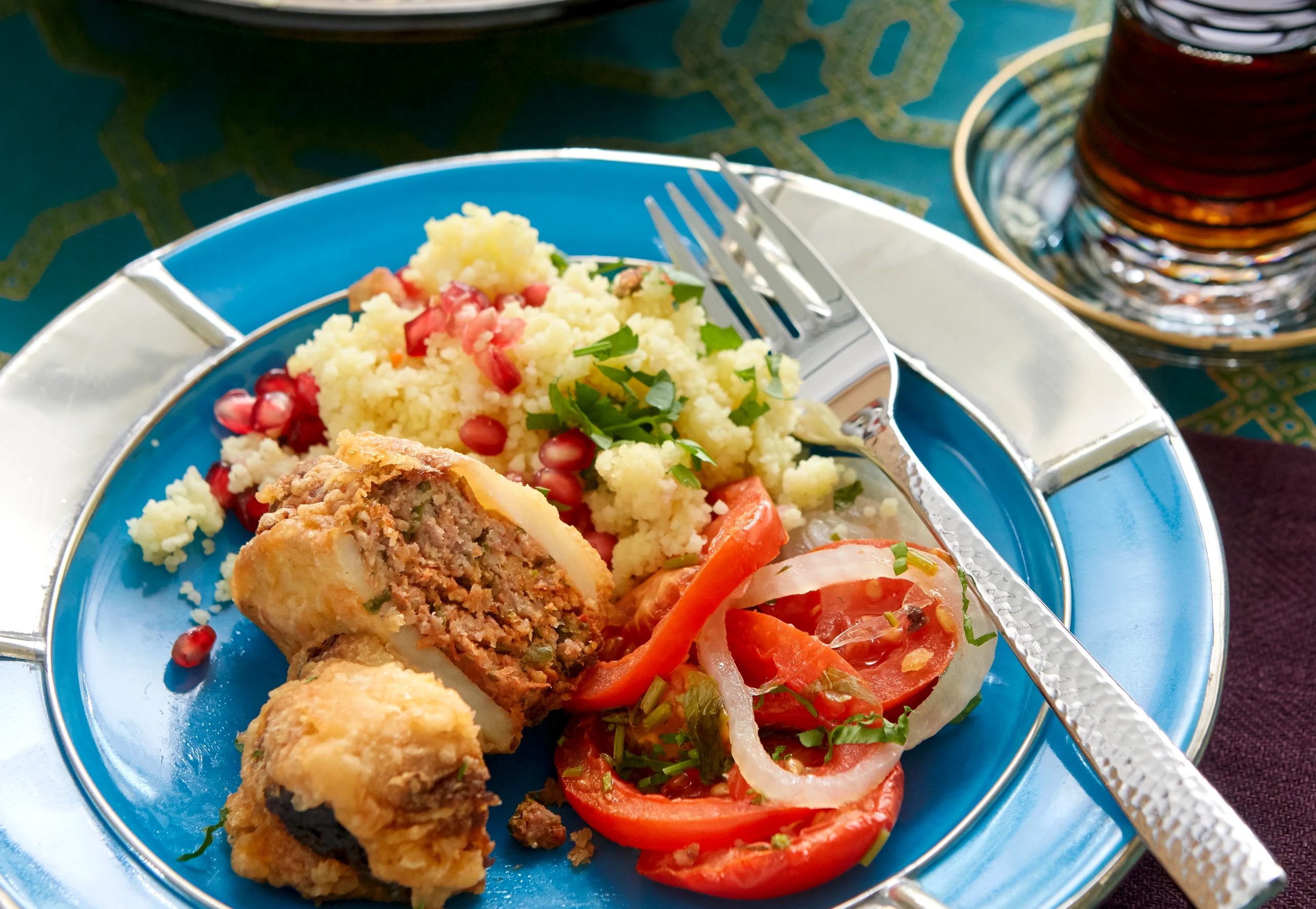 - Für die Füllung Zwiebel und Knoblauch schälen und hacken. Petersilie fein schneiden. Weckerl in Wasser einweichen, ausdrücken und mit Faschiertem, Zwiebel, Knoblauch, Petersilie, Tomatenmark, Zimt und Kreuz- kümmel vermischen, salzen und pfeffern.
