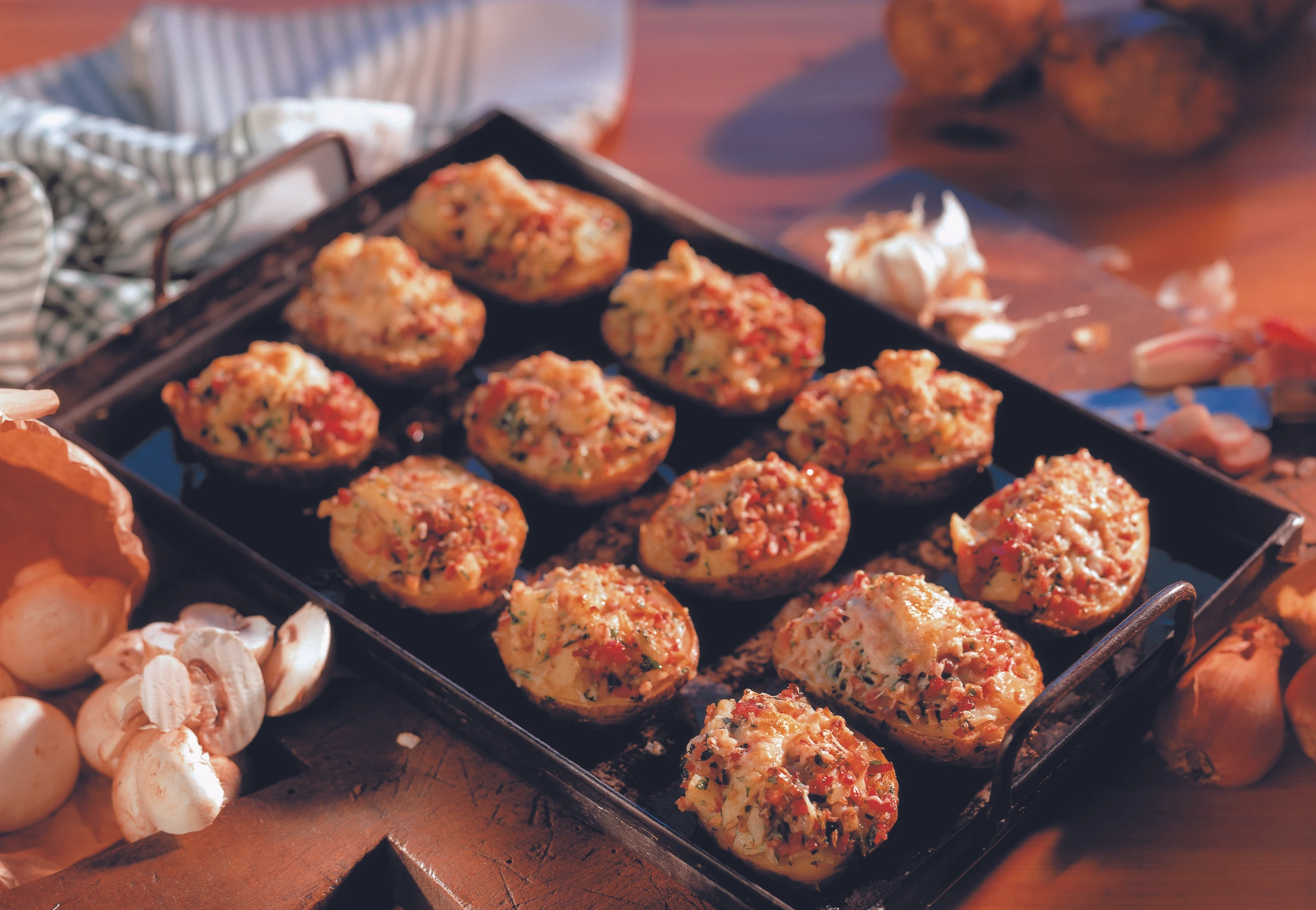 Überbackene Erdäpfel mit Schinken-Champignonfülle