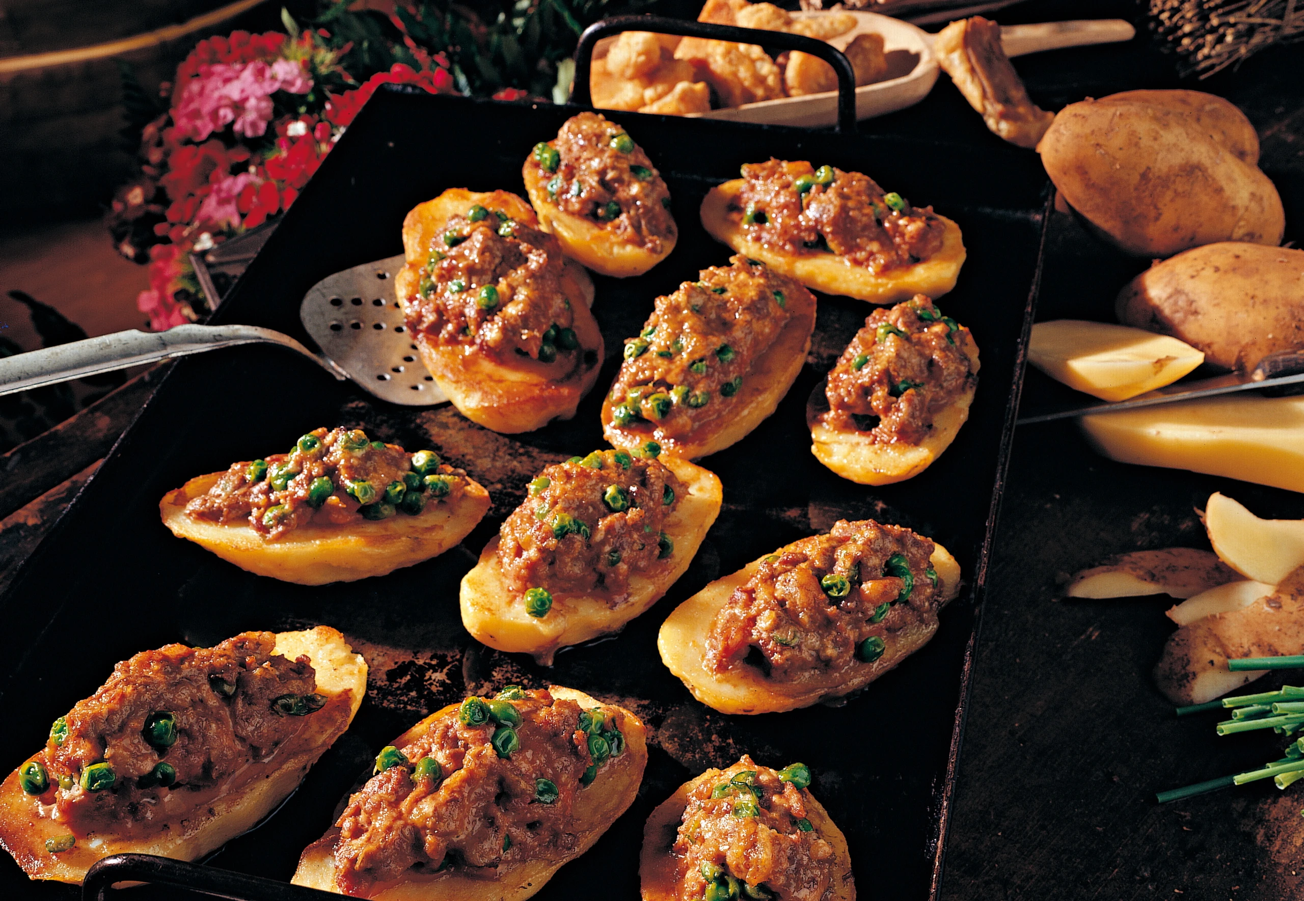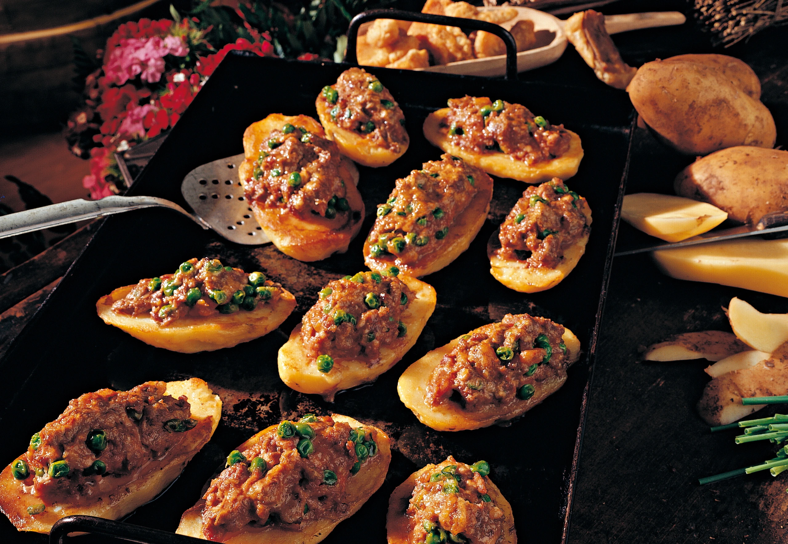 Ein Backblech mit Backpapier belegen. Backrohr auf 180 °C vorheizen. Erdäpfelhälften vor dem Füllen mit der Schnittfläche nach unten in wenig Öl knusprig anbraten, mit der Masse füllen, auf das Blech setzen und ca. 1/2 Stunde im vorgeheizten Rohr (mittlere Schiene) backen. Dazu serviert man Salat oder Gemüse.