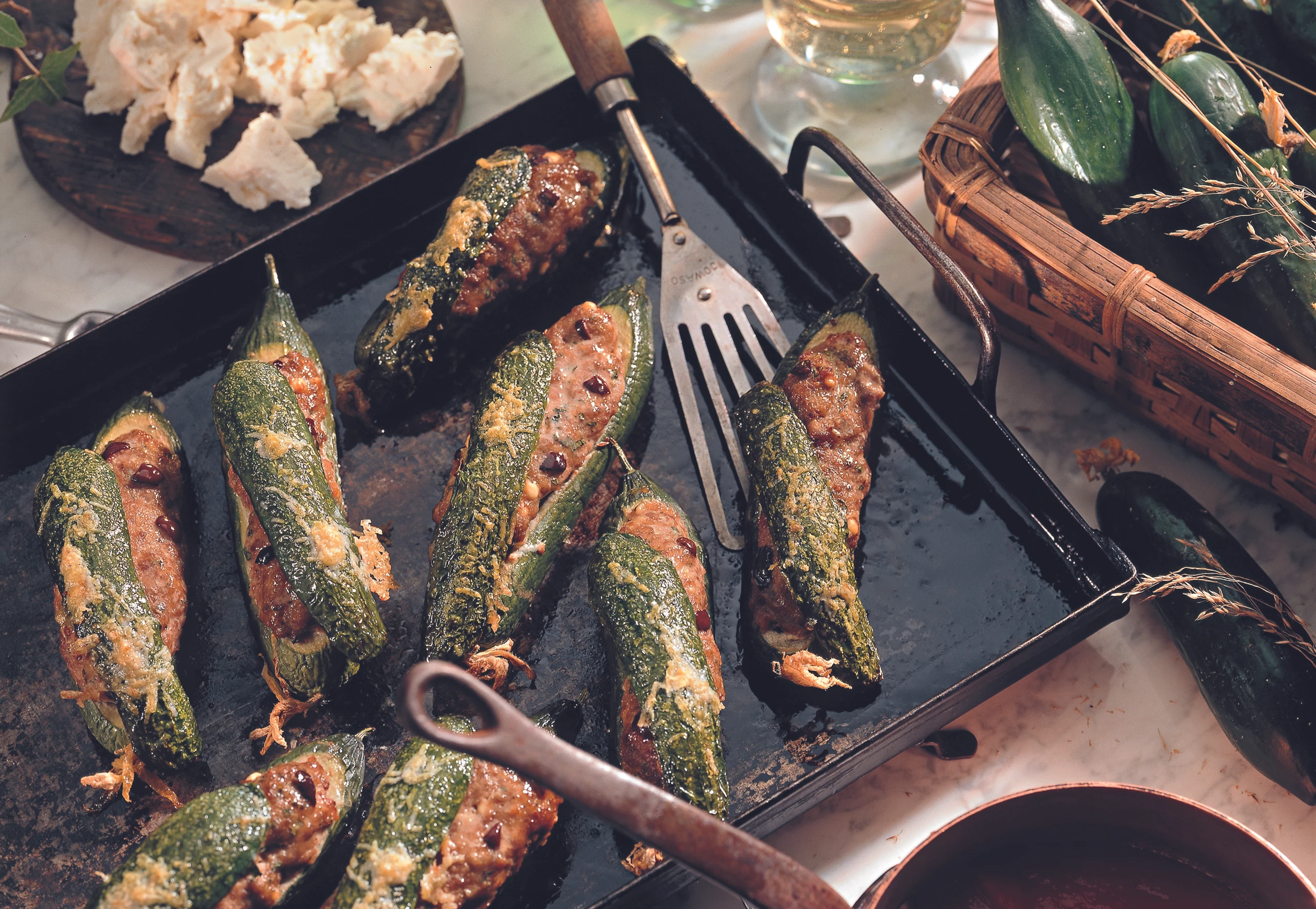 Toastbrot ausdrücken und mit Faschiertem, Gurkenfruchtfleisch, Käse, Zwiebel, Ei, Oliven und Petersilie vermischen. Fülle mit Salz, Pfeffer, Thymian und zerdrücktem Knoblauch würzen.