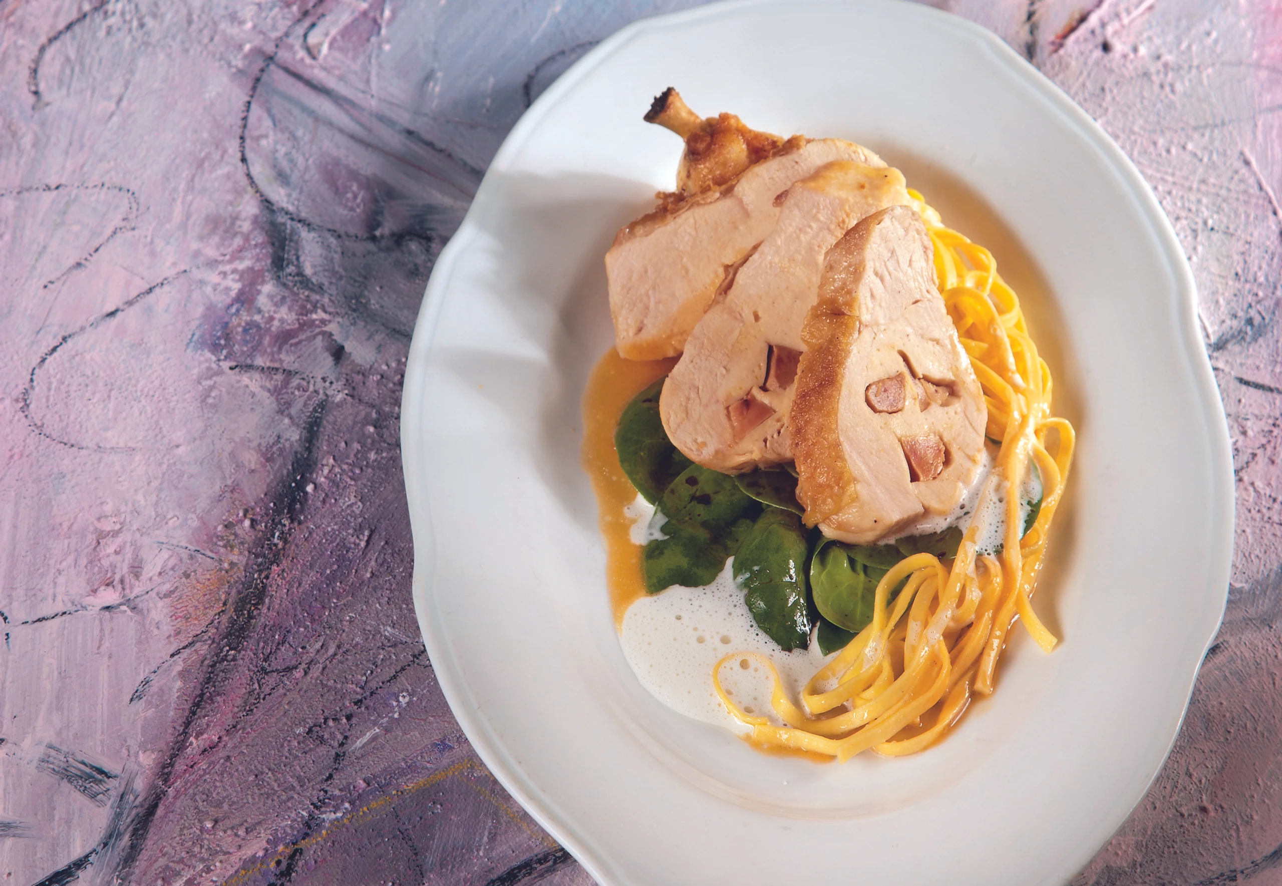 - Tagliolini in Salzwasser bissfest kochen, abseihen, abtropfen lassen und in aufgeschäumter Butter schwenken. Balsamico salzen, pfeffern und mit 1 EL Öl verrühren. Spinat marinieren. Filets in Scheiben schneiden mit Tagliolini, Spinat, Bratensaft und Traminersauce anrichten.