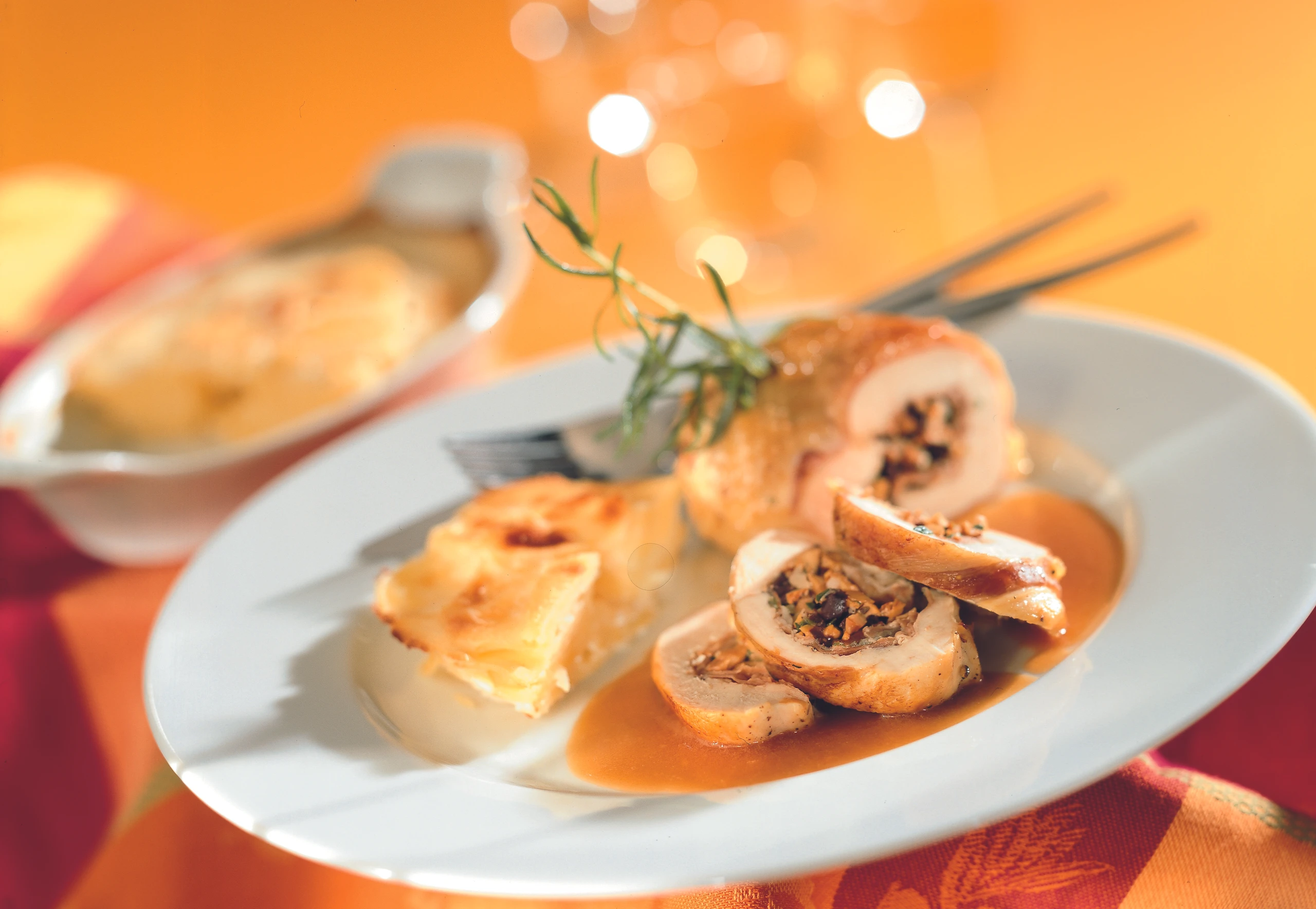 Hühnerröllchen aus dem Rohr nehmen, in Alufolie gewickelt warm halten. Bratfond in einen Topf gießen, kurz erhitzen und durch Einrühren der restlichen Butterstücke binden. Hühnerröllchen halbieren, mit dem Bratenfond und Ricotta-Erdäpfeln auf vorgewärmten Tellern anrichten.
