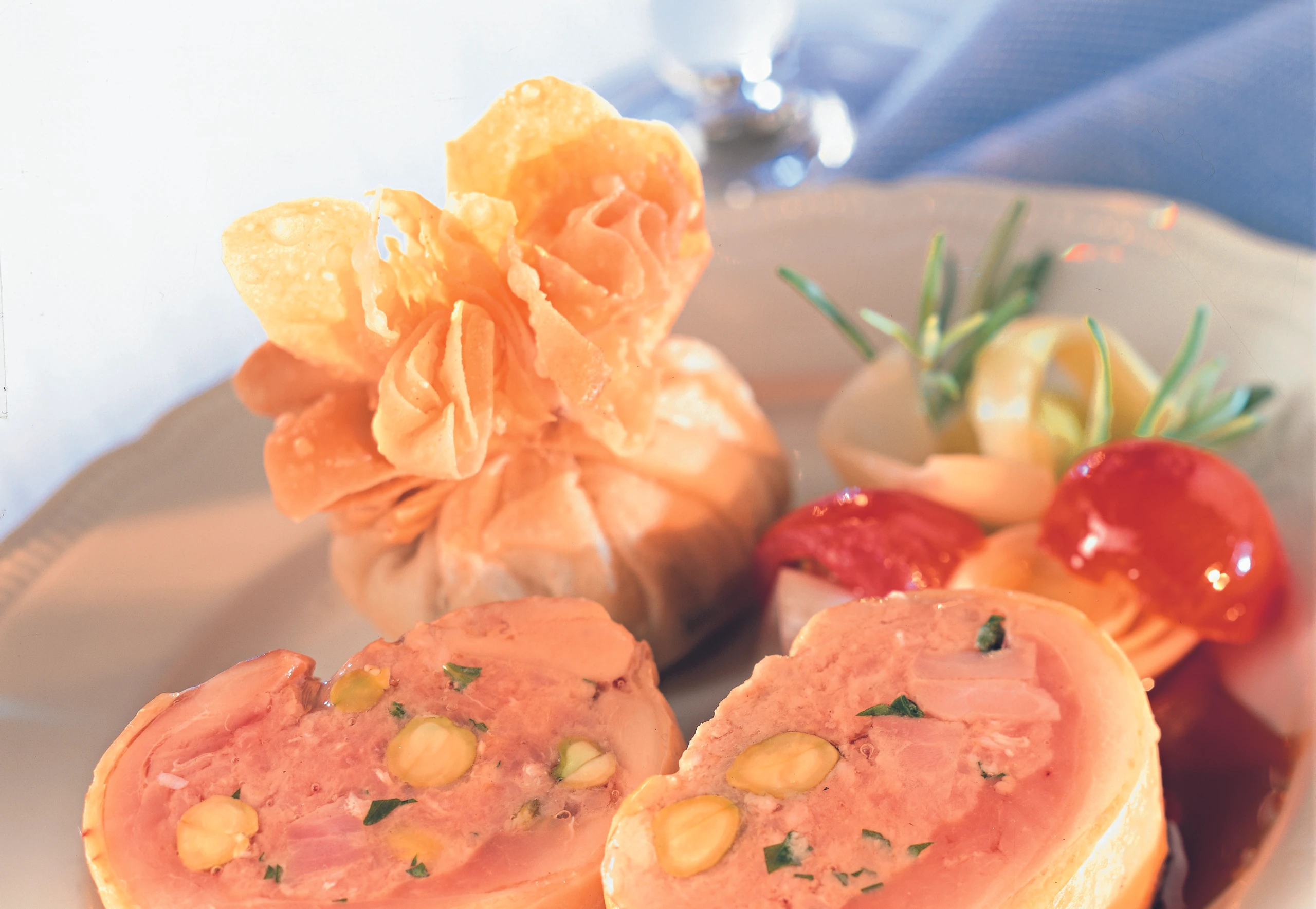 Schinken klein würfelig schneiden. Hühnerbrust in kleine Stücke schneiden, faschieren und mit Obers, Ei, Petersilie, Schinken und Pistazien vermischen, mit Salz und Pfeffer würzen und kalt stellen.