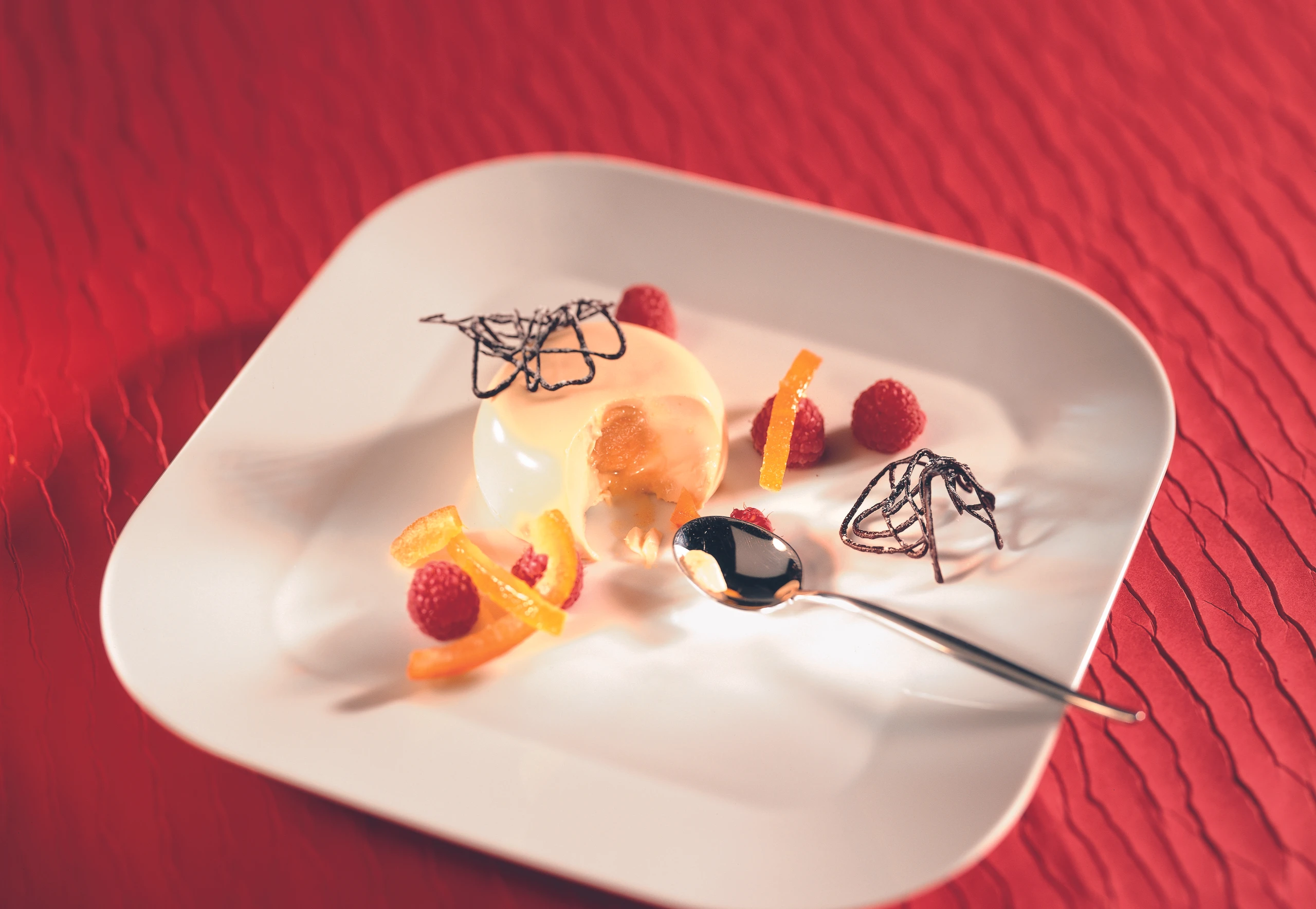 Vor dem Servieren Förmchen kurz in heißes Wasser tauchen und die Panna Cotta auf Teller stürzen. Mit kandierten Orangenschalen, Himbeeren und Schokogitter garnieren.