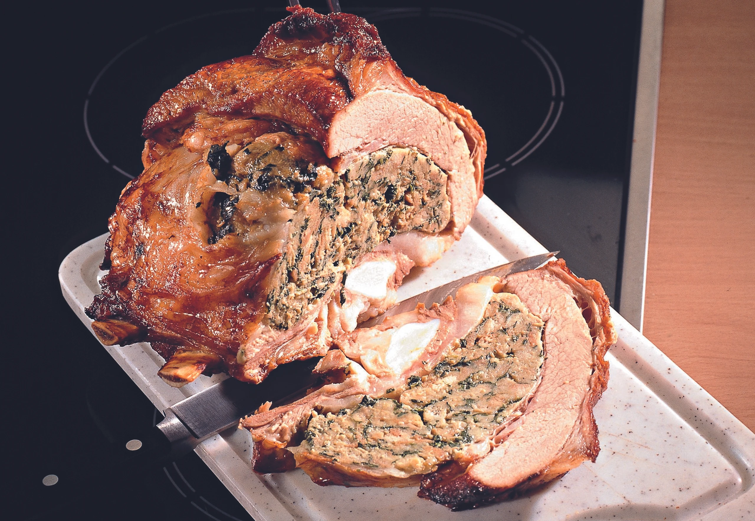 Backrohr auf 160 °C vorheizen. Die vorbereitete Kalbsbrust innen und außen mit Salz und Pfeffer würzen. Fülle gut durchmischen, in die Brust füllen und mit einem Metall- oder Holzspieß verschließen. Fleisch in wenig Öl auf beiden Seiten anbraten.