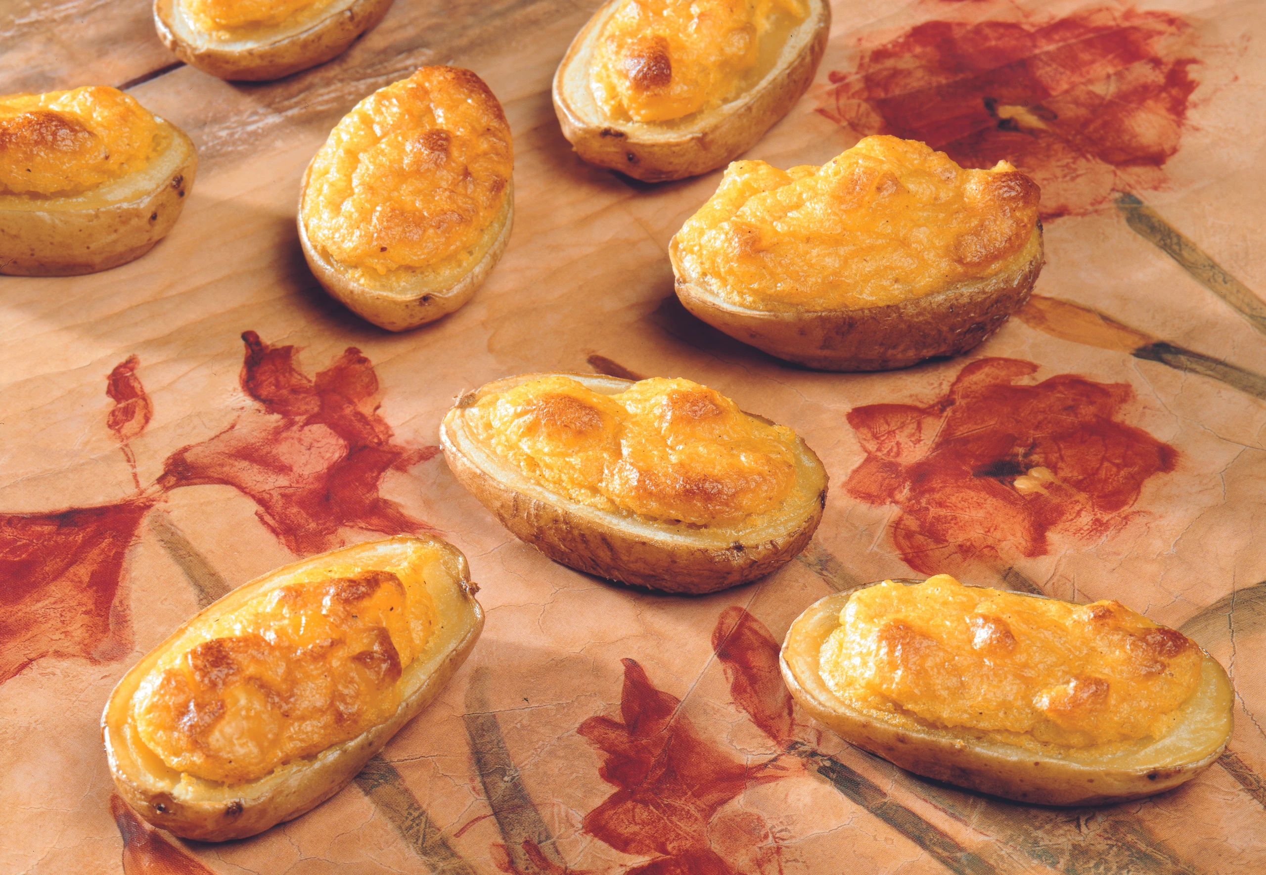 Backrohr auf 180° C vorheizen. Backblech mit Papier belegen. Kartoffeln der Länge nach halbieren und an den Unterseiten abflachen. Kartoffeln mit einem Kugelausstecher oder einem kleinen Löffel aushöhlen und auf das Backblech legen.