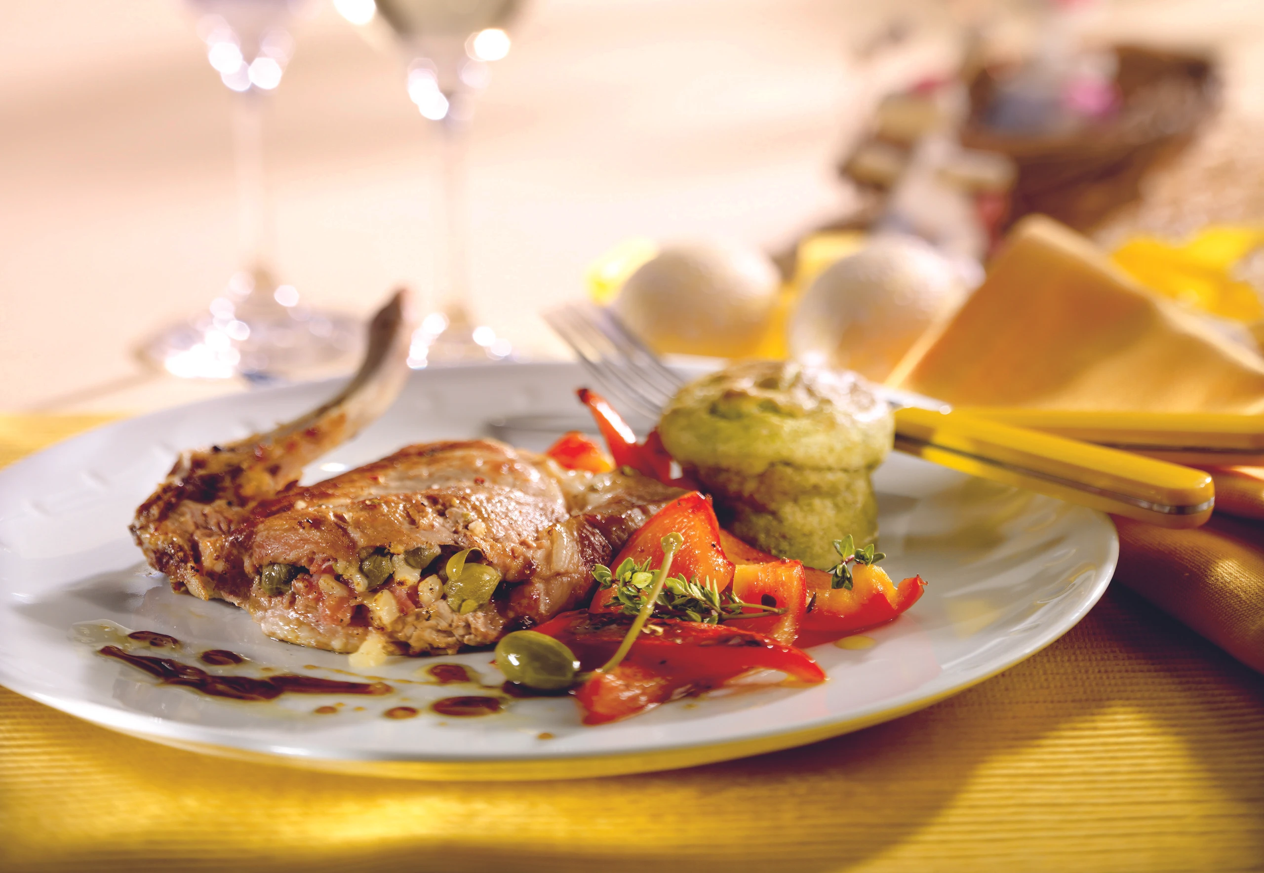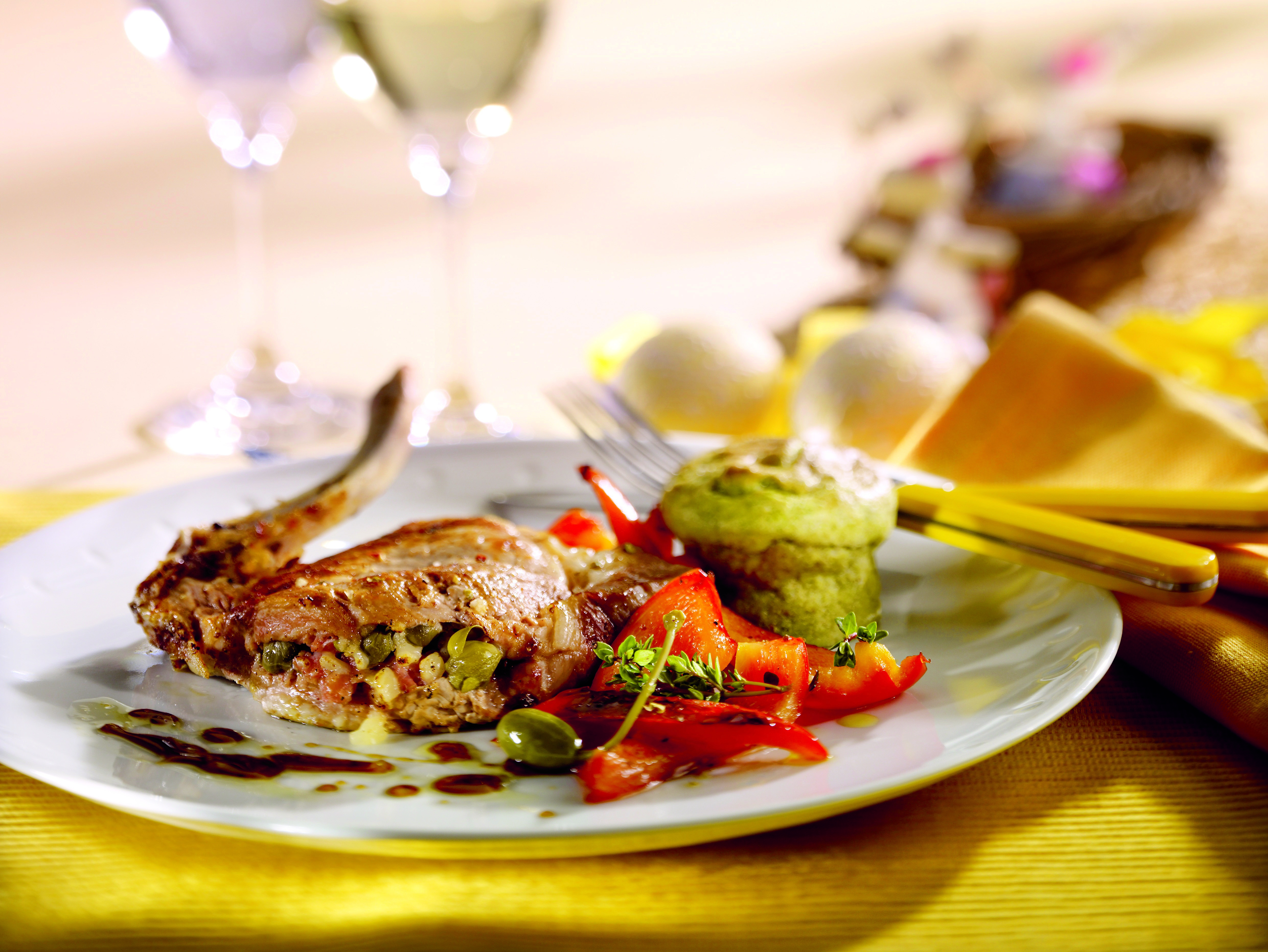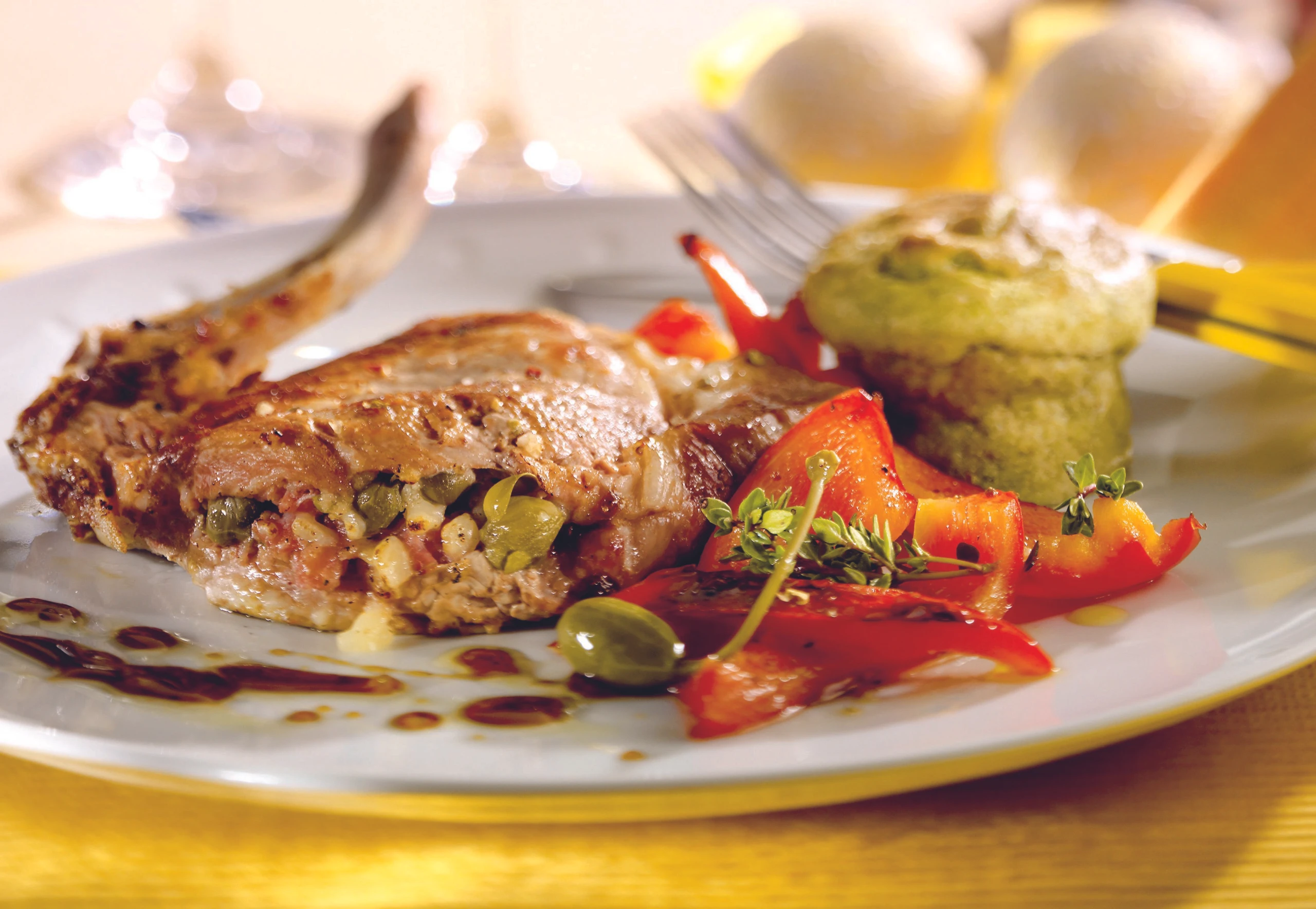 Mit einem kleinen, spitzen Messer ca. drei Viertel tief in das Fleisch stechen und eine Tasche einschneiden. Den Einschnitt in beide Richtungen erweitern. Koteletts mit der Schinkenmasse füllen, Öffnungen zusammendrücken und mit Zahnstochern fixieren. Für die Garnitur Paprika putzen und in 2 cm große Stücke schneiden.
