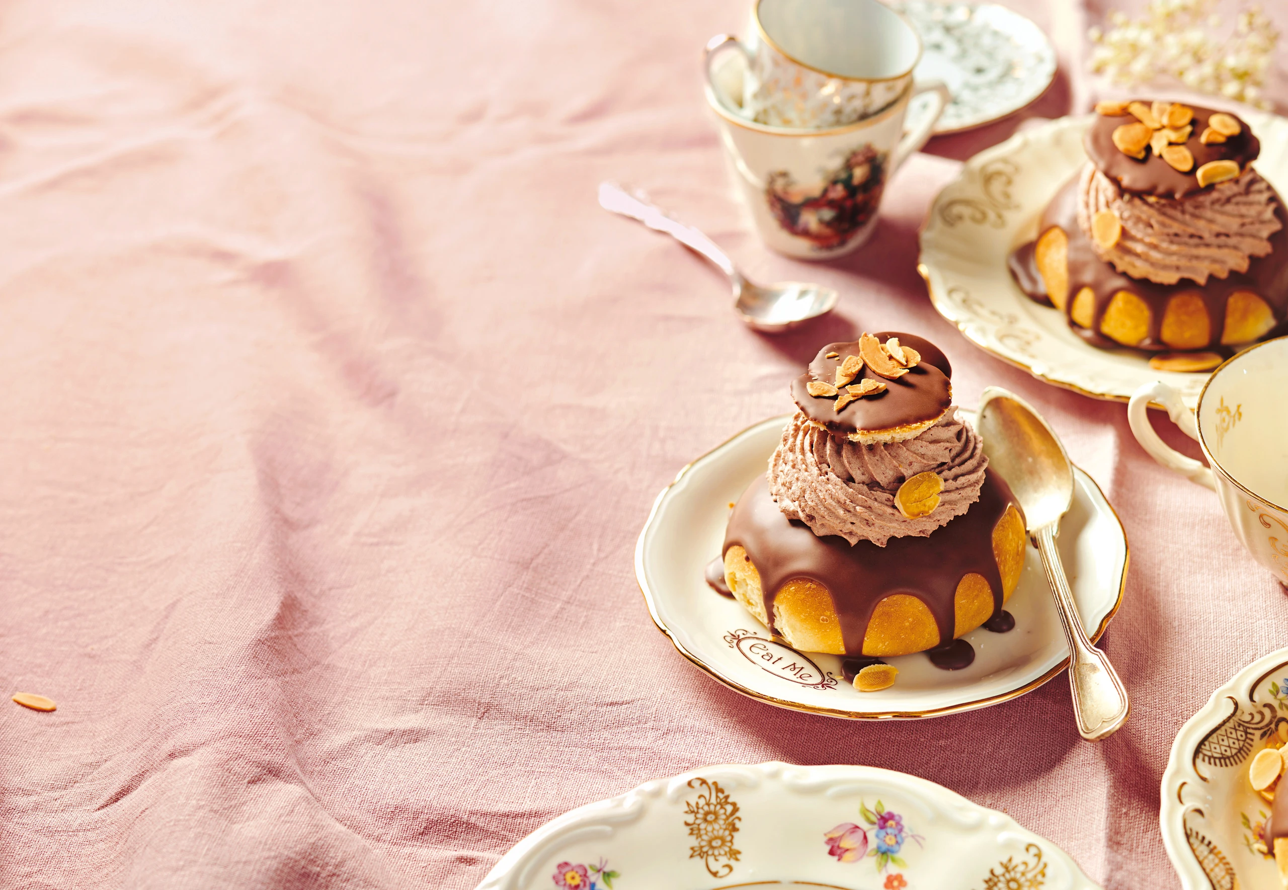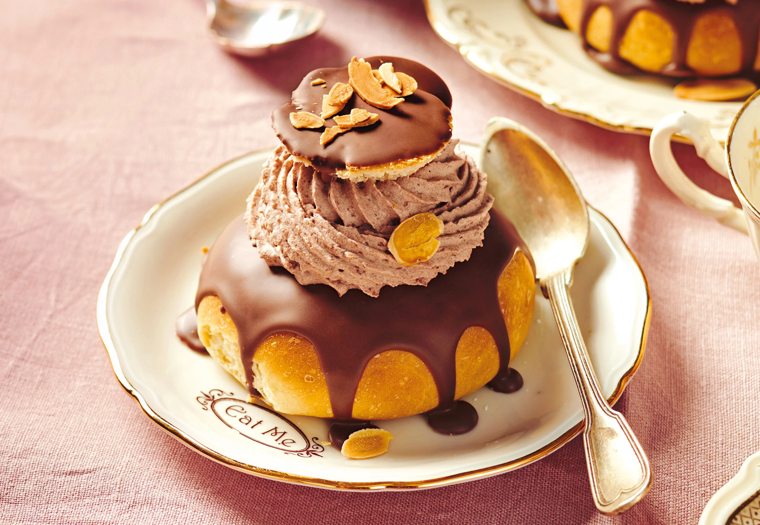 Mandelcreme in die Krapfen füllen und das Schokoobers darauf dressieren. Deckel darauf setzen und mit den übrigen Mandelblättchen bestreuen.