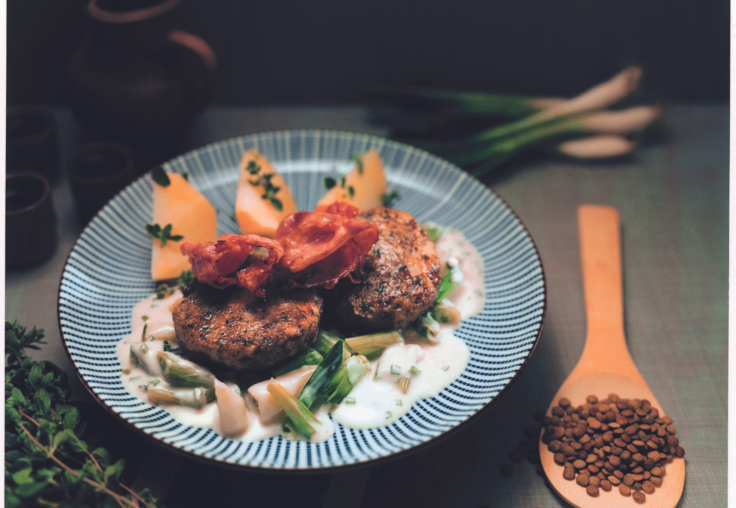 Schinkenblätter halbieren und im Bratrückstand beidseitig knusprig braten. Linsenlaibchen mit dem Schinken, dem Gemüse und eventuell Majoranerdäpfeln anrichten.