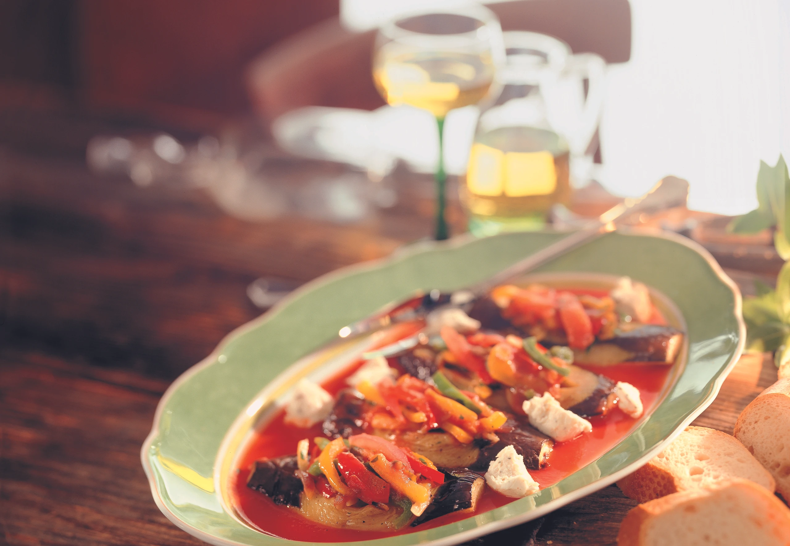 - Melanzanestücke aus dem Rohr nehmen, ein wenig flach drücken und der Länge nach einschneiden. Einschnitte ein wenig erweitern und mit je 1–2 EL Gemüsemasse füllen. Paradeissaft mit übrigem Olivenöl sowie Salz und Pfeffer gut verrühren und über die gefüllten Melanzane träufeln. Melanzane nochmals ins vorgeheizte Rohr geben und ca. 6 Minuten backen.