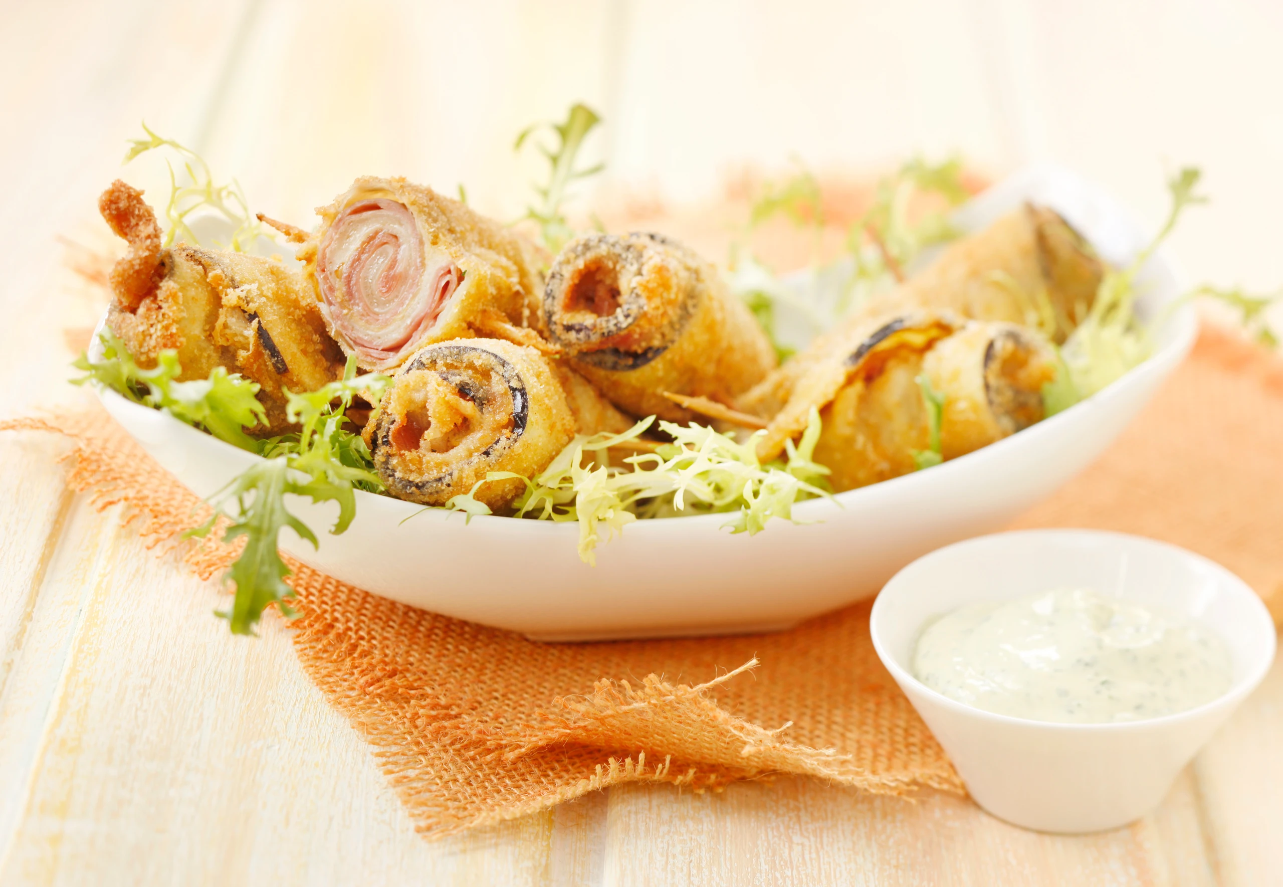 Essig, Salz, Pfeffer und Öl verrühren, Salat damit marinieren. 3 Finger hoch Öl erhitzen. Röllchen darin goldgelb backen, herausheben, auf Küchenpapier abtropfen lassen, mit Salat und Kräutersauce servieren.