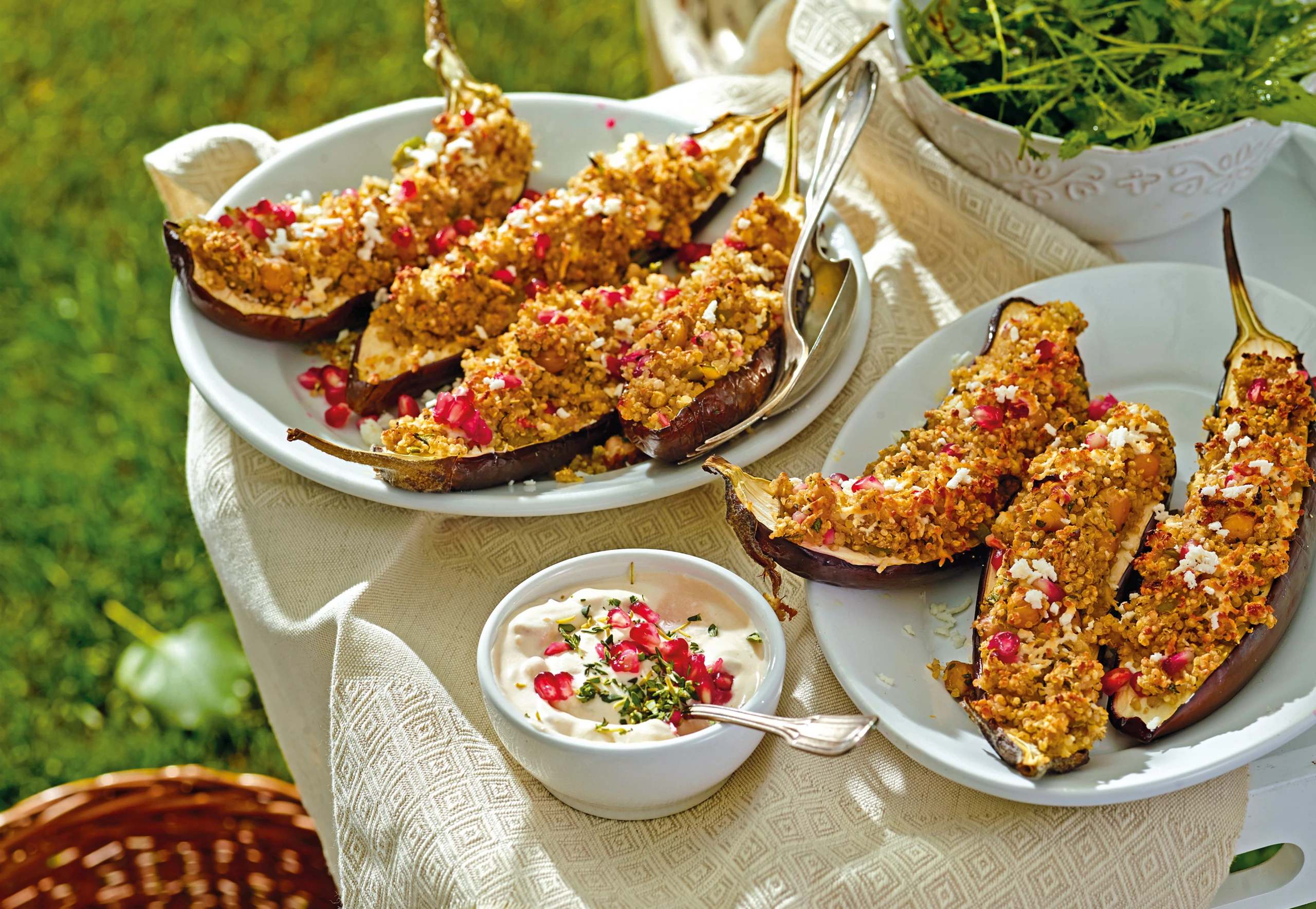 Gefüllte Mini-Melanzani mit Kichererbsen-Quinoa, Feta und Granatapfelsauce