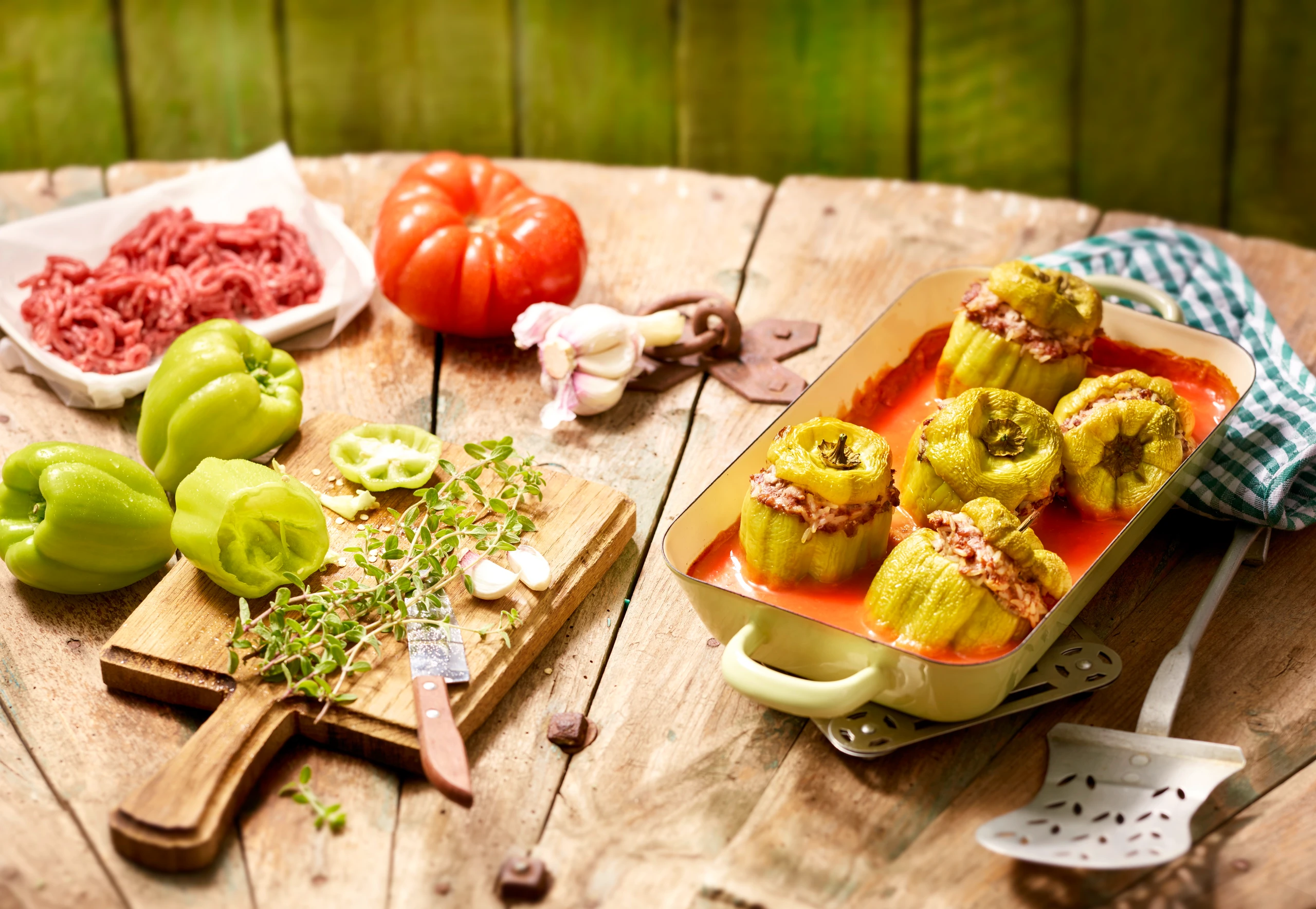 Von den Paprika Deckel abschneiden, Kerne und Trennwände entfernen. Paprika mit dem Faschierten füllen. Paprika mit den Deckeln verschließen und in eine Auflaufform geben.