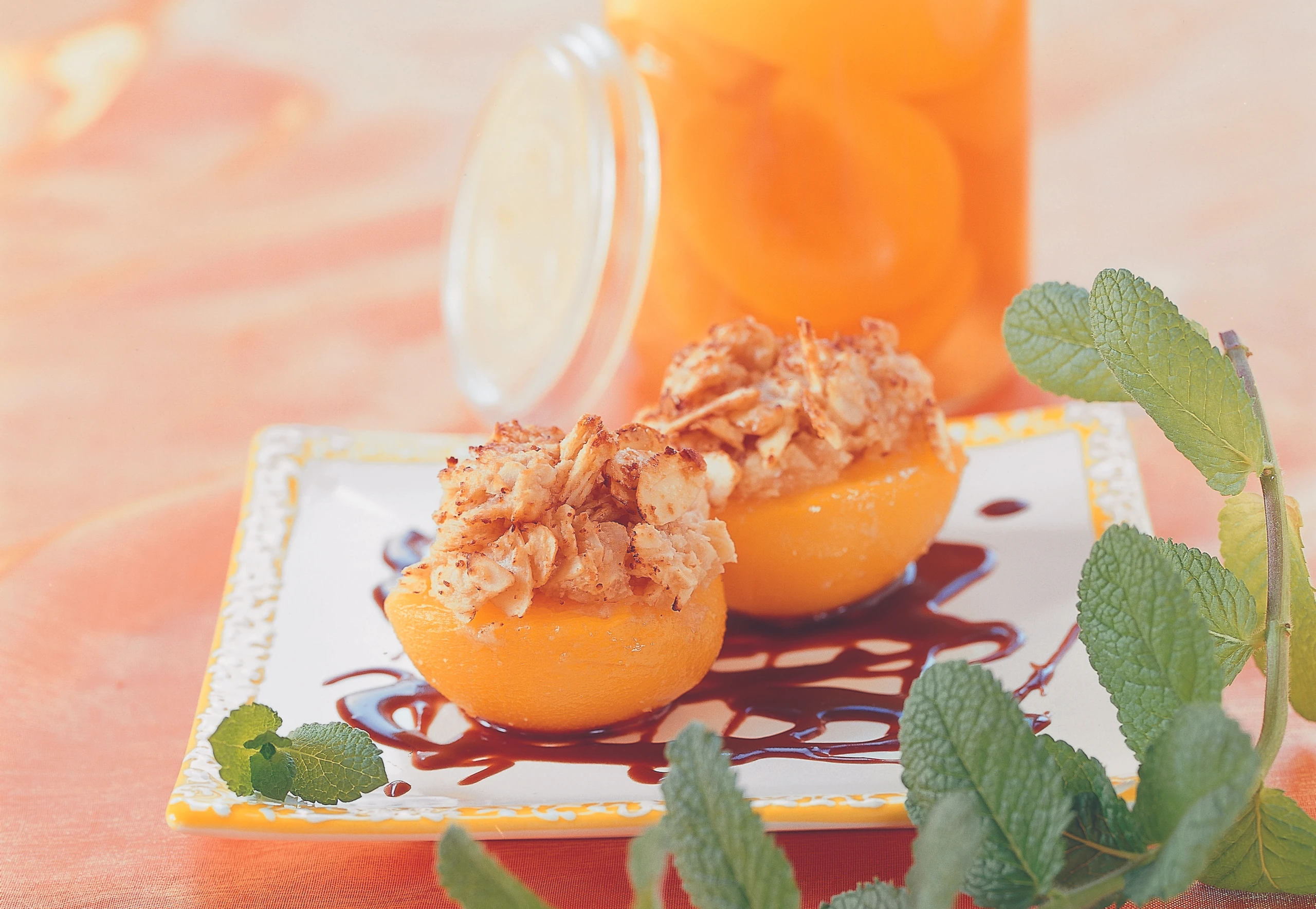 Pfirsichhälften mit der Masse füllen, in die Form setzen und mit Staubzucker bestreut im Rohr (mittlere Schiene / Gitterrost) ca. 15 Minuten backen. Pfirsiche mit der Nougatsauce anrichten und mit Minze garniert servieren.
