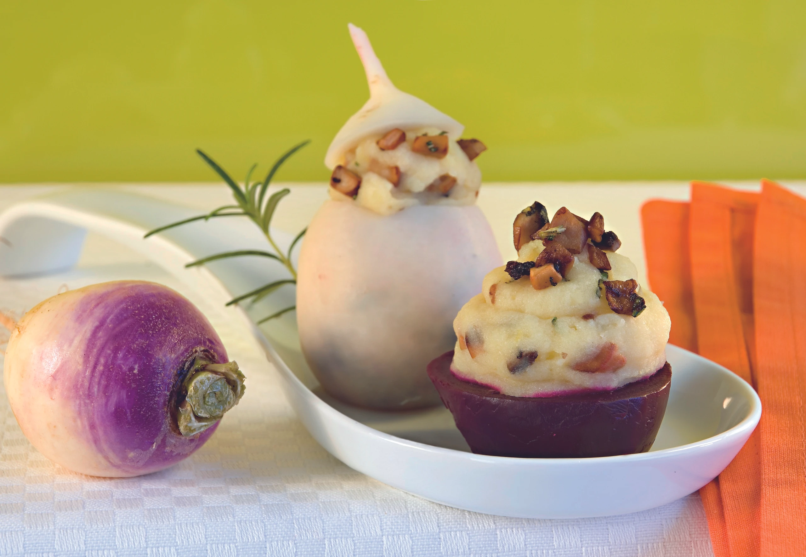 Rüben schälen, halbieren und unten gerade schneiden. Rüben aushöhlen, mit dem Püree füllen und heiß servieren.