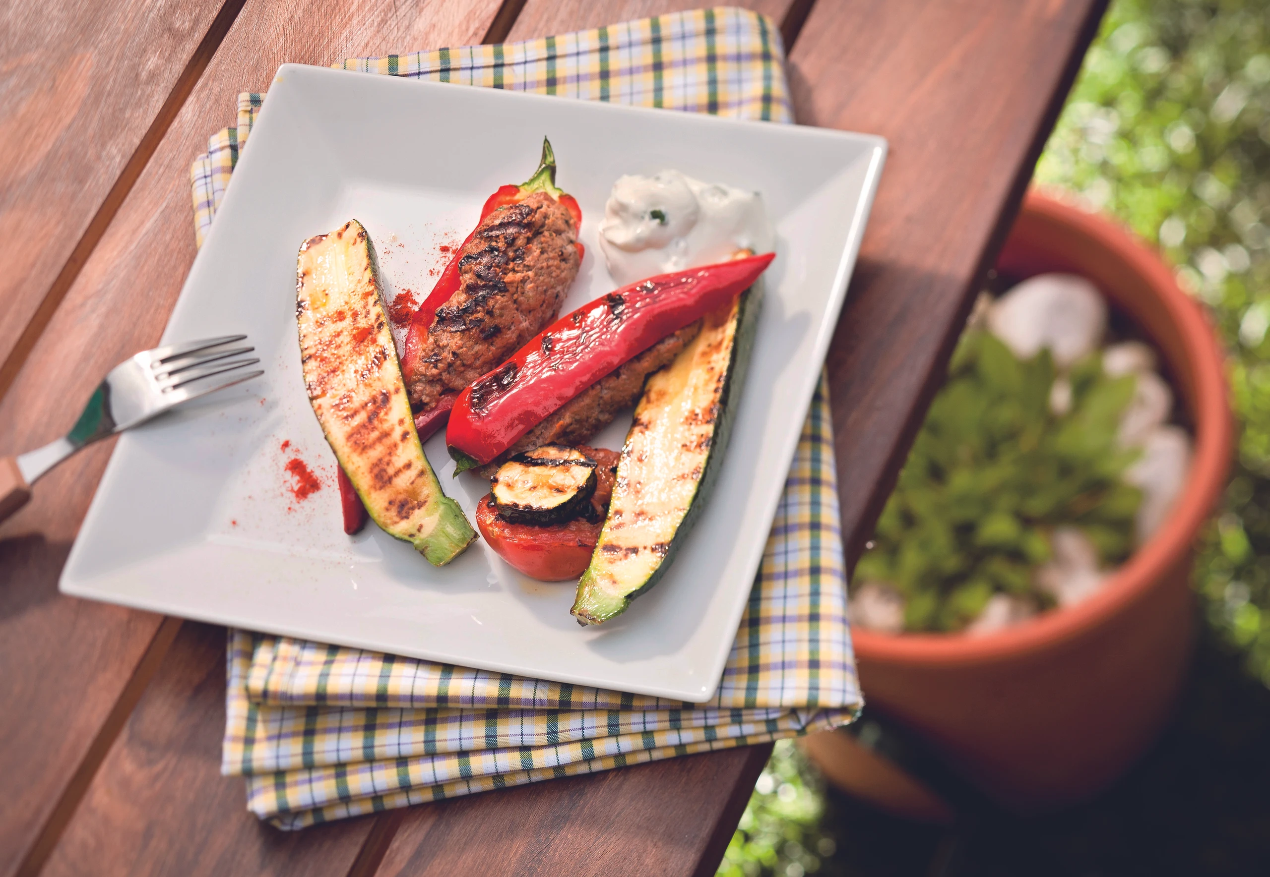 Gefüllte Paprika und die Gemüsehälften rundum dünn mit Öl bestreichen, auf den heißen Grill legen und beidseitig grillen. Gegen Ende der Garzeit mit Salz und grob geriebenem Pfeffer würzen. Gefüllte Paprika, Gemüsehälften und Sauce anrichten und mit wenig Paprika bestreut servieren.