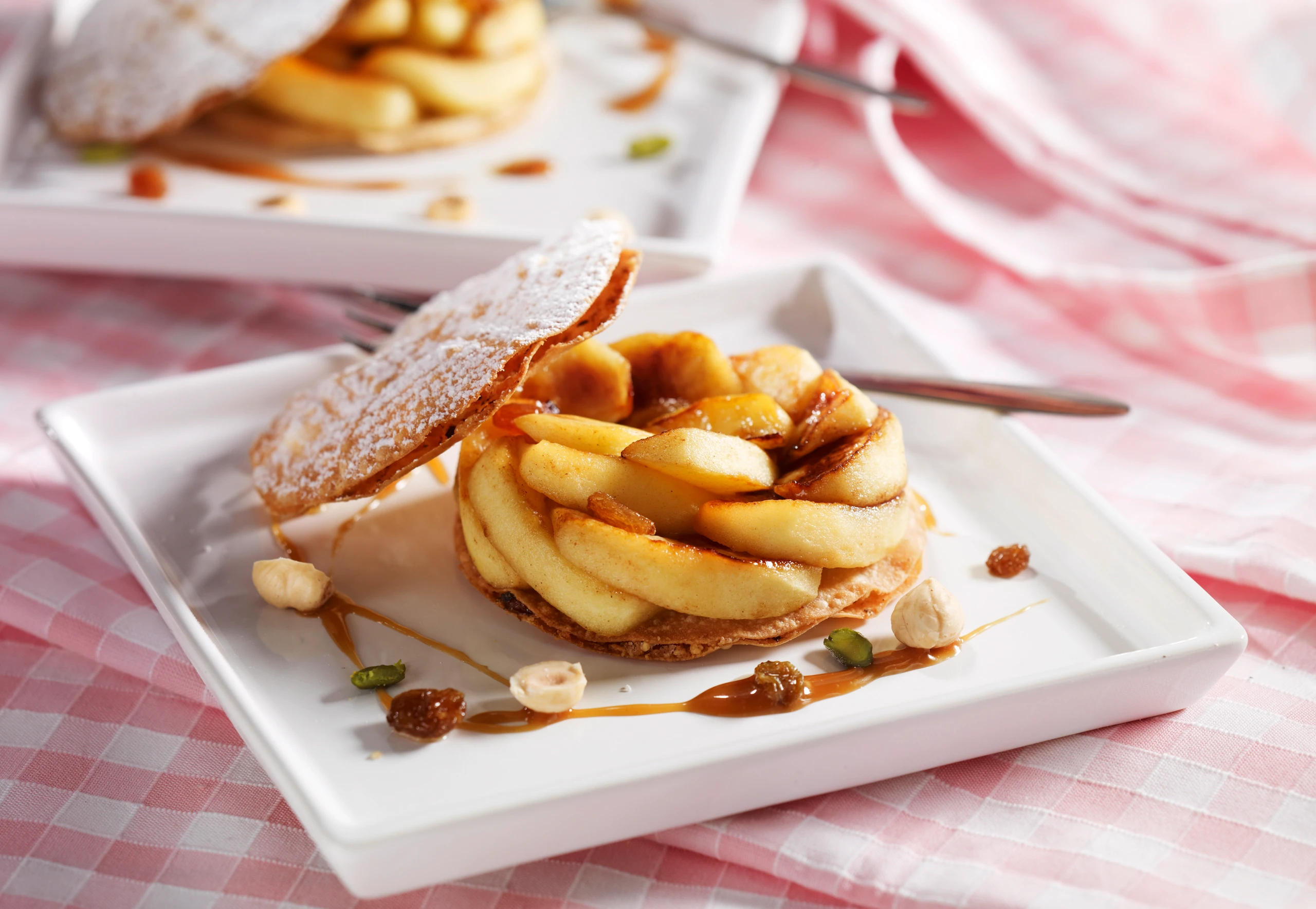 Die Hälfte der Strudelblätter auf Tellern anrichten, mit den Apfelspalten belegen und mit übrigen Teigscheiben abdecken. Strudelblätter mit Staubzucker bestreuen und mit der Sauce garniert servieren.