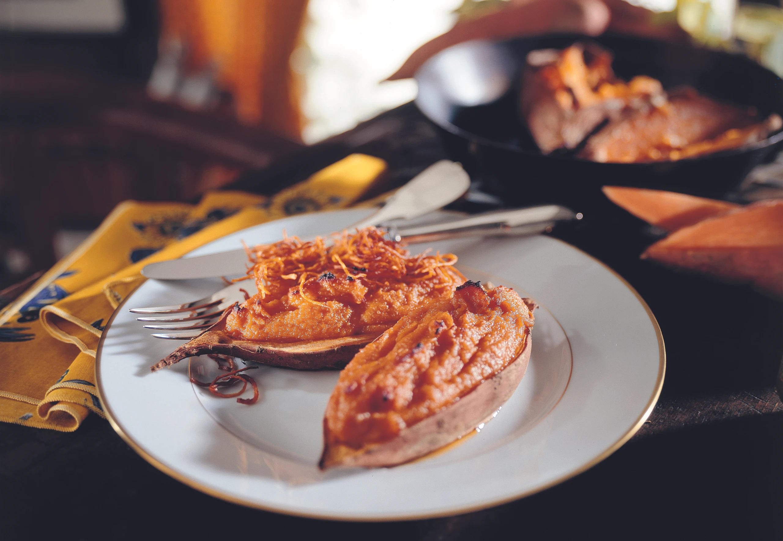 Inzwischen das herausgeschnittene Kartoffelfleisch in feine Streifen schneiden und kurz in heißem Fett knusprig backen. Kartoffelstroh auf Küchenpapier abtropfen lassen und über die gefüllten Süßkartoffeln streuen.