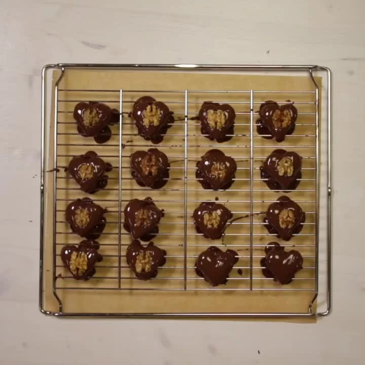 Die Hälfte der Kekse mit Marmelade bestreichen. Restliche Kekse darauf setzen und leicht andrücken. Kuvertüre und Kokosfett über einem Wasserbad schmelzen. Kekse mit der Kuvertüre überziehen und mit einer halben Walnuss belegen.