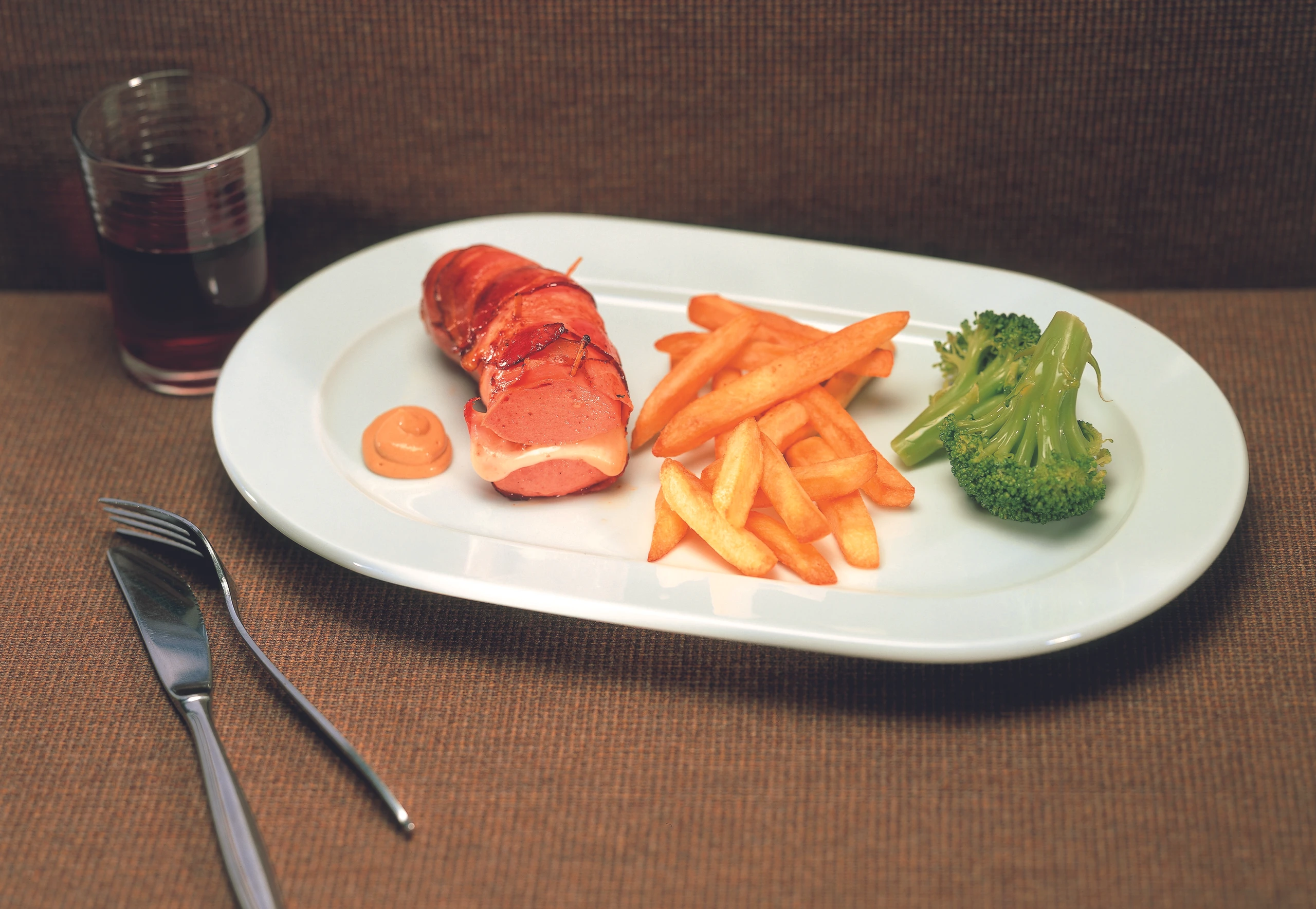 Die gefüllten Würste in Scheiben schneiden und mit Senf anrichten. Dazu passen Brokkoli und Pommes frites.