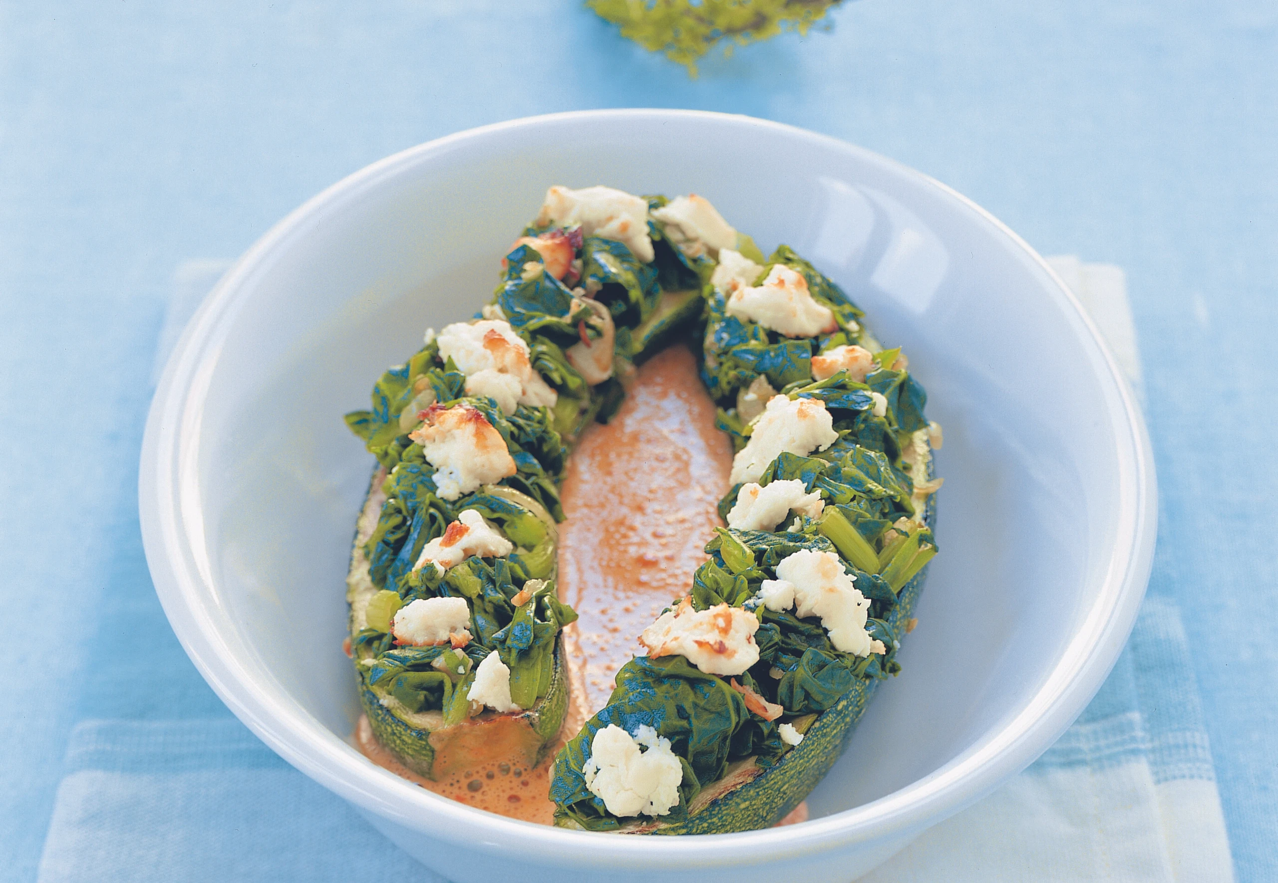Gefüllte Zucchini mit Spinat, Feta und Paprikasauce