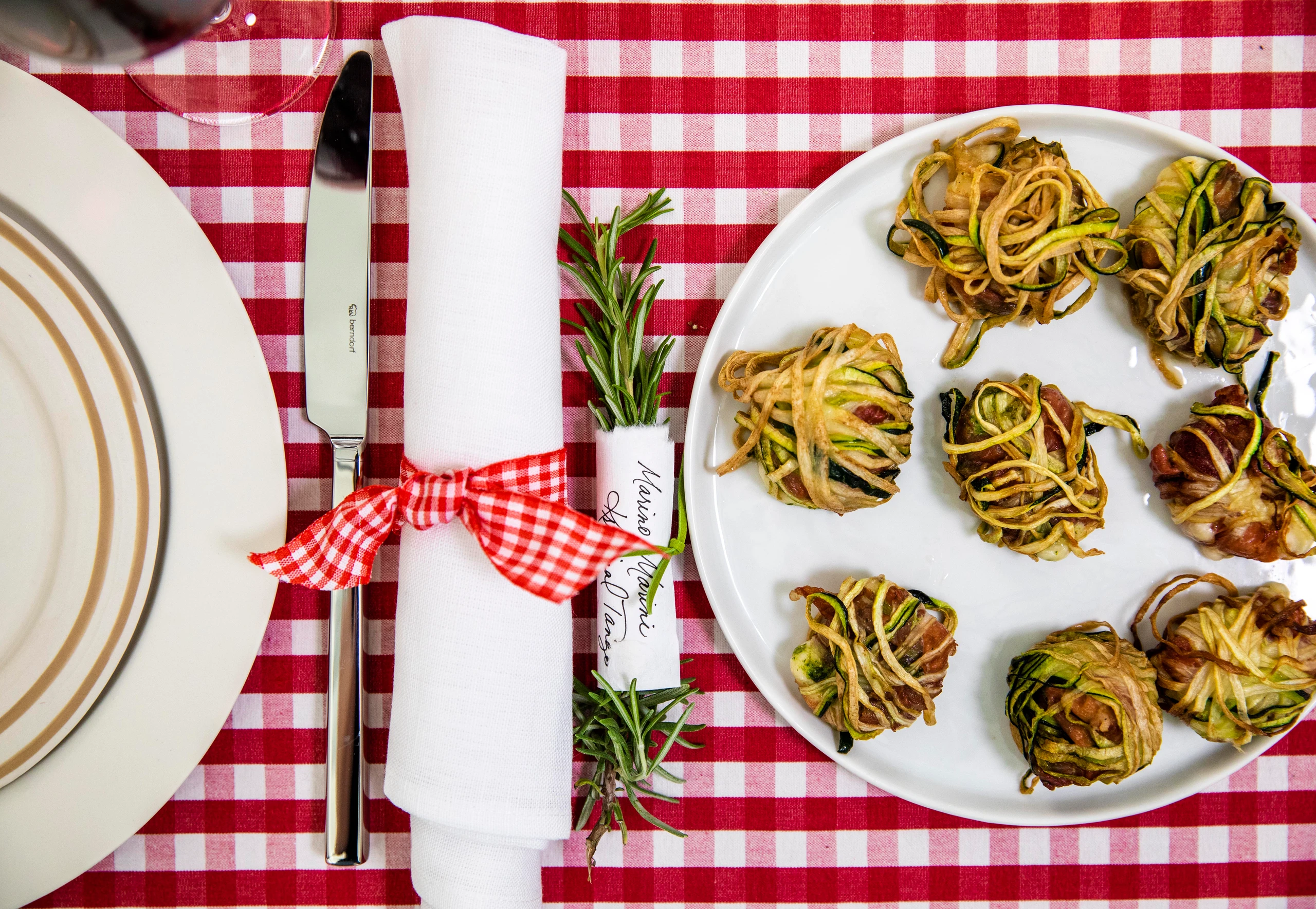 Zucchini mit dem Spiralschneider in dünne Schnüre schneiden. Käse- päckchen mit Zucchinischnüren eng umwickeln. Enden im Geflecht fixieren.